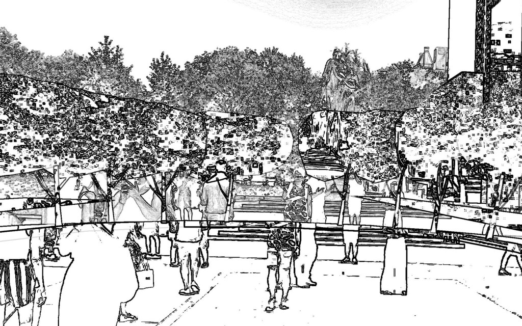 The walk continues with Cao Fei’s “Trade Eden,” an interactive depiction of a factory that grants the viewer the opportunity, by tapping or dragging boxes on a conveyor belt, to invoke chaos or establish order. Then viewers partake in Carsten Höller’s “Through,” a video game-like piece that sends users to find a randomly selected partner’s energy and then, alongside them, exit the current realm through a beaming portal. In doing so, Central Park’s Grand Army Plaza turns into an indistinguishable, glitching 2D landscape.