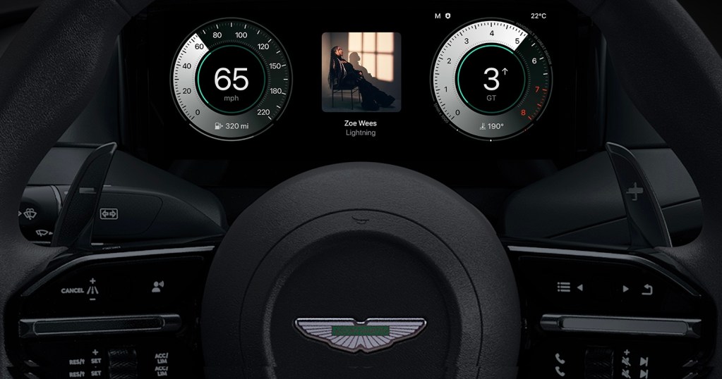 Aston Martin has meticulously customized CarPlay to complement its brand ethos and driving experience. They have opted for a minimalist dual gauge layout that highlights their driver-centric cockpit using precise tick marks on the gauges, paying homage to the brand’s analog history. The text “Handbuilt in Great Britain” hugs the tachometer and the interface is accented with British racing green as a reminder of their heritage. The next generation of CarPlay is expected to be integrated into the Aston Martin lineup in 2024. We do not yet know if it will be available as an update in any existing models or if it’s limited to new cars.