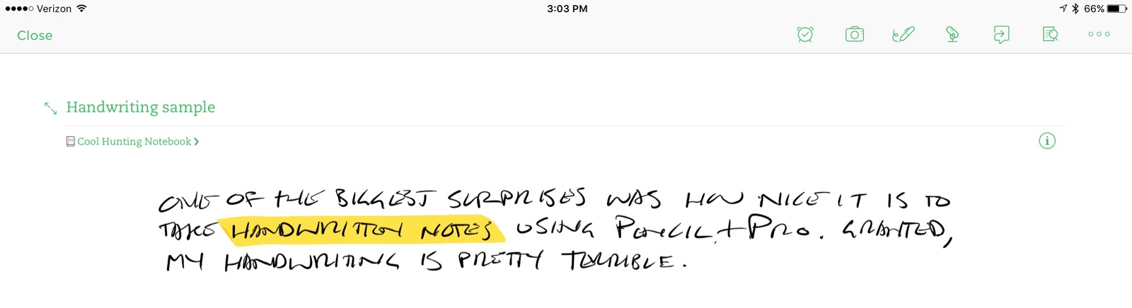 One of the biggest surprises was how nice it is to take handwritten notes using the iPad Pro. We’ve been fans of Evernote for years and found that the ability to use Pencil with it was effortless. Beyond simply taking handwritten notes, there are basic drawing tools to help capture thoughts on the fly. The added benefit of using Evernote is that their handwriting recognition works quite well and the software automatically indexes your notes so that when searching in the app even words you wrote by hand appear.