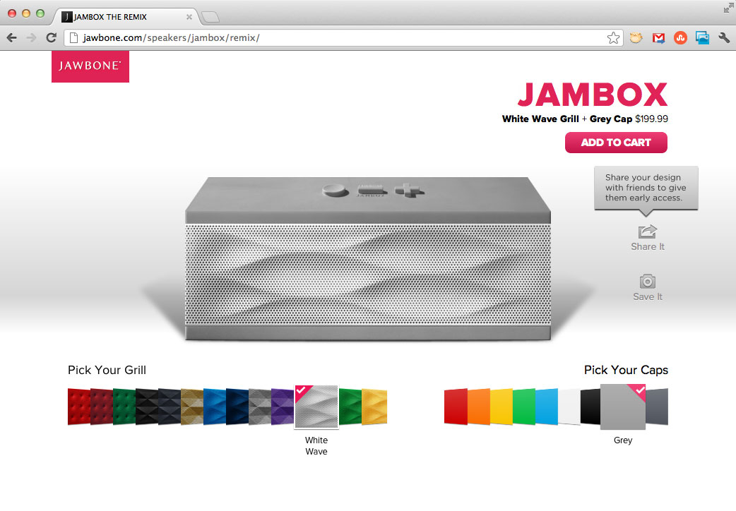 When something is modular and colorful creative-types can’t help but mix and match parts. As fans of the Jawbone’s Jambox since its launch, we have a few here at CH HQ and are guilty of dismantling and reassembling them in different colorways. With today’s launch of Remix, any Jambox customer can choose their favorite color combinations when ordering their own Bluetooth speaker.