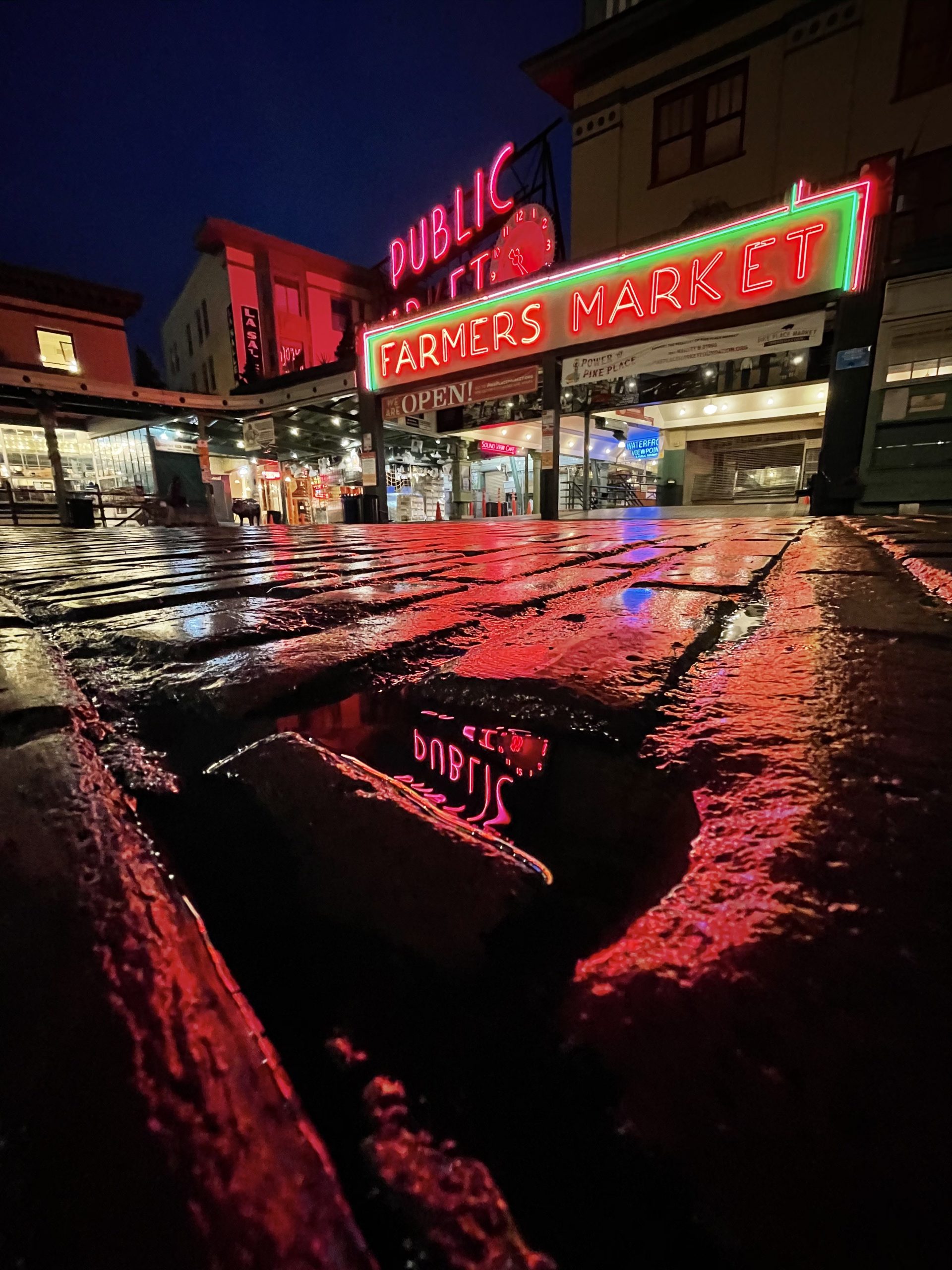 Horine lives downtown and not far from Seattle’s iconic Pike Place Market. “Despite the tourism, I find it very interesting as a hub of Seattle. This city has always been in flux and there’s not a lot of history so the market to me is like a European town square. It’s got a heart and some interesting parts to it. There are some really weird corners and fun little vignettes.” The market, shown above, looks like a movie set during the golden hour through the wide lens on the iPhone. At night the neon reflects in puddles and spills over slick cobblestones rendering gradients captured smoothly from the ultrawide lens.
