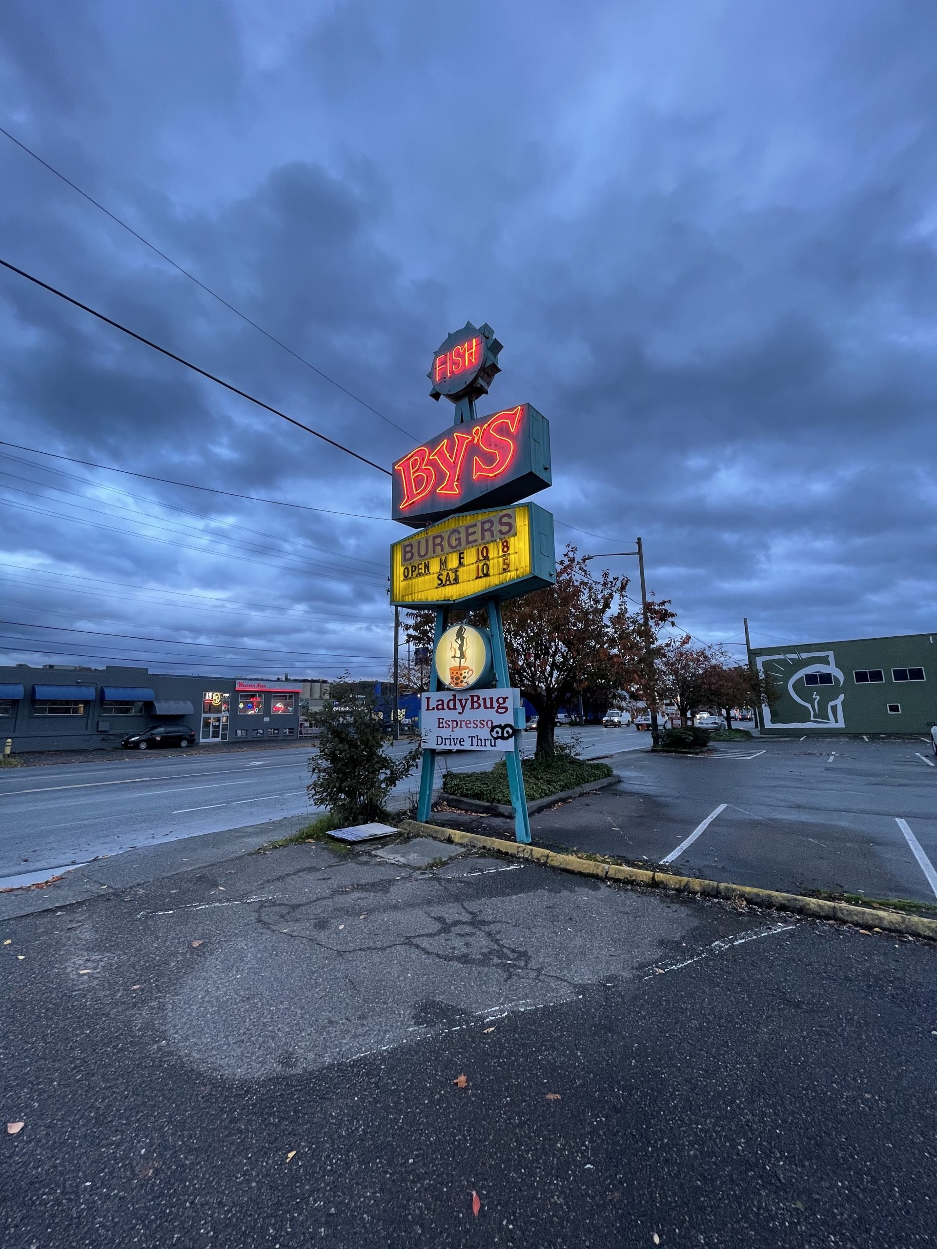 The industrial district south of downtown (SoDo) has businesses brightly badged by their neon. Horine imagines a community centered around sign making. “There’s a neon sign shop, which explains why there are so many signs. One of those is, ‘if you build it, they will buy it.’ I want to do some research on this neon sign shop and figure out how long it’s been in business for. I’m assuming it’s been forever because these signs are so old. But you know, it gives it this kind of throwback image.”