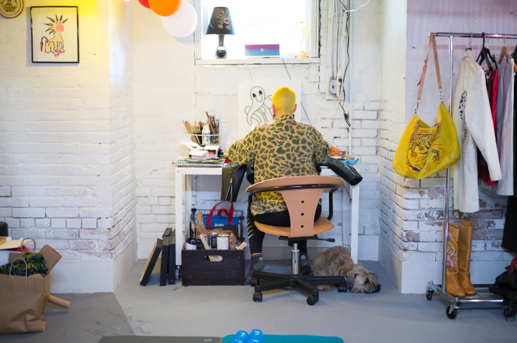 On a bright morning last month, when we visited Swedish-born painter Elin Lundman at her Beacon, NY studio we learned more about Super Happy Ghost Co—her art and fashion line of upcycled goods adorned with original, hand-painted characters. Lundman finds jackets, bags and other items that are ready for a second life. The practice started years ago when she found a trench coat at a thrift store in Woodstock, NY and painted it freestyle with monsters from her imagination. We watched “Abby” come to life on a black leather motorcycle jacket while Yubaba, Lundman’s pup, quietly kept us company.
