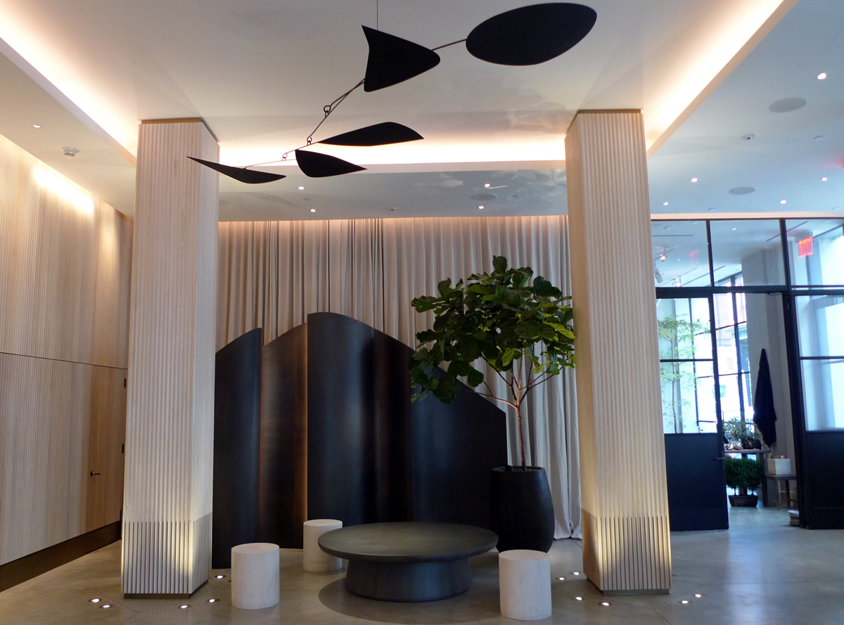 The design team gutted the structure (initially built in 1961) and reinvented the space. It’s a collaboration between Beyer Blinder Belle Architects & Planners, Space Copenhagen, with lighting design by Isometrix, that achieves the Danish minimalist and urban look. Each of the 221 guest rooms feature oak plank floors, 11-foot ceilings, natural light from large windows, and blush pink bed throws by Society. Stunning artworks (chosen by owner Aby Rosen and 11 Howard’s Creative Director Anda Andrei) are scattered throughout the hotel—in addition to the Calder at the entrance, works by Dan Attoe, Hiroshi Sugimoto and Holly Fowler can be found throughout.