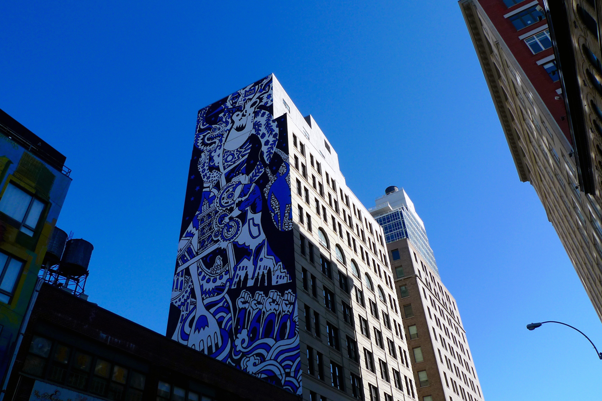 In collaboration with Groundswell (an organization founded in 1996 by artists, activists, and educators to create collaborative public art projects), a giant mural celebrating the culture of the neighborhood now faces Canal Street. The young Groundswell artists were mentored by Jeff Koons and pay homage to Basquiat. The work is combination of elements that represent the neighborhood and local history: from the fact that SoHo was the site of the first free black settlement in New York in the 1600s to the importance of the Italian community in the area. Factory machinery refers to the local garment district factories, a dragon for the Asian communities in the area, and a horn-player for the music history there.