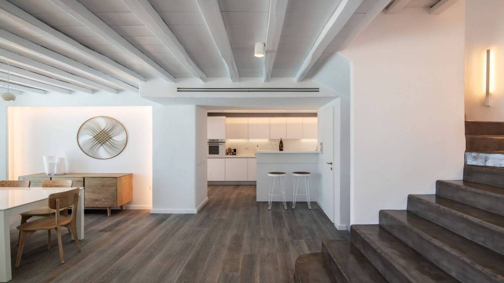 Standing out for its rustic exterior and sublime decor within, the Villa Boutique sleeps fewer (four bedrooms for eight guests) but boasts plenty: from a built-in bbq, to a pergola and sunbeds overlooking the crystal waters below. This property is also located close to the center of the island’s thrilling nightlife, but is hidden away enough to remain super-private, quiet and serene.