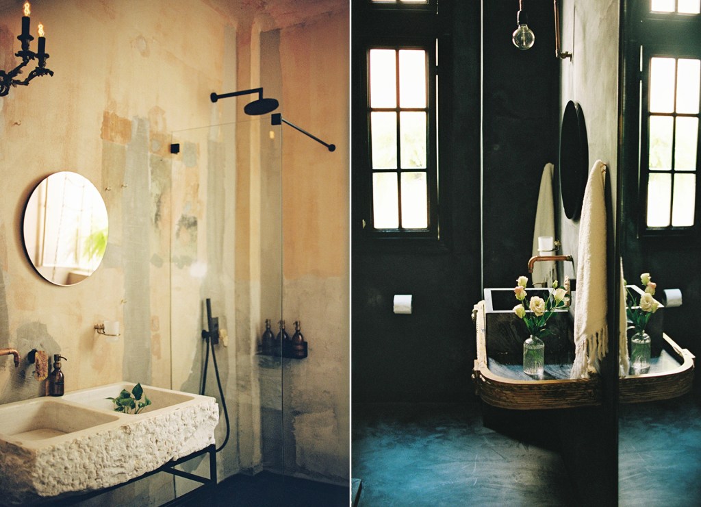 The bathrooms in particular balance the new and old, with ancient Greek references juxtaposed with contemporary design. In place of traditional taps, there are large stone handles over deep sinks (these organic handles also appear in showers and bar-tops) and while the rain showers are powerful, the bathroom curtain is a sumptuous vintage fabric.