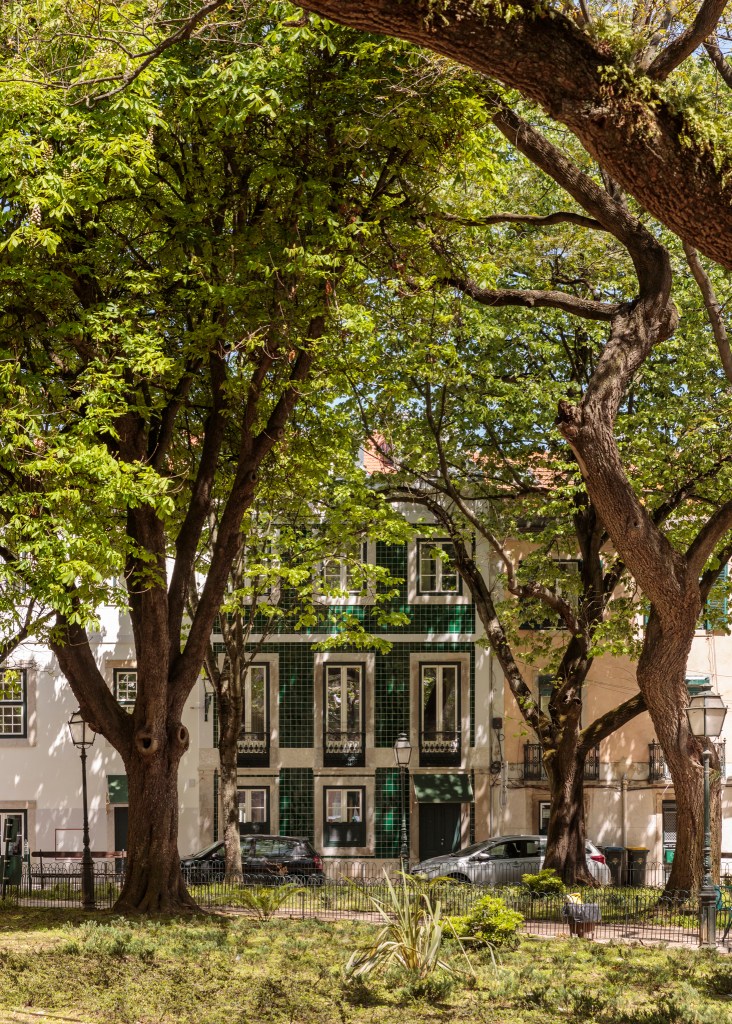 Lisbon’s small but pretty Jardim das Amoreiras—a park founded in 1759 by the Marquis of Pombal when he planted 300+ mulberry trees, intending them to spur the silk industry—is framed by 18th century townhouses that were once the homes of silk workers. Two of those once-abandoned buildings have been converted into the charming Hotel das Amoreiras.