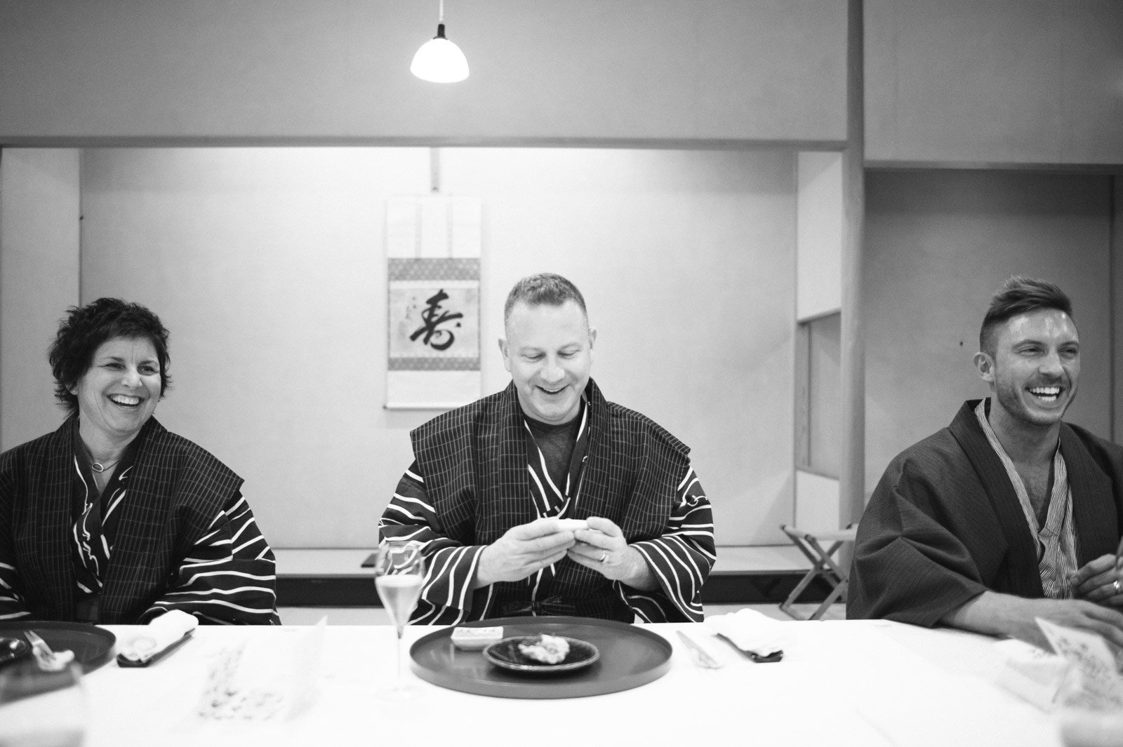 Being winter, our yukata (indoor kimonos) were complemented by wool overcoats. Seasonality is a cornerstone of Japanese culture. While this applies to all rituals, it’s most apparent in cuisine. At Asaba, the Kaiseki meals are a series of small plates featuring local, seasonal delicacies. Our meals here were some of the best we’ve ever had in Japan and the delicious flavors were equally matched by artful presentations. We enjoyed breakfast sitting on the floor at a table in our room, though dinners were shared with friends we were traveling with in a private dining room overlooking the pond. These were timed perfectly to watch the paper lanterns be lit and placed by one of the ryokan’s conscientious staff in a boat.