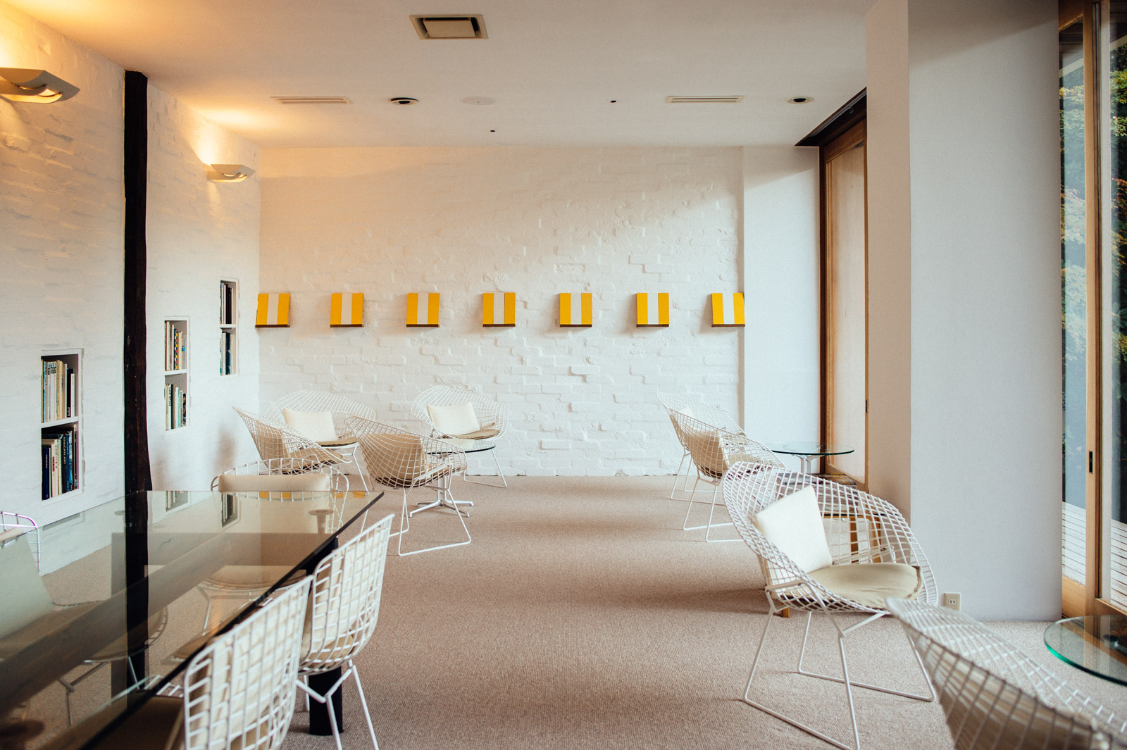 The east-meets-west blend is apparent even in the smallest details—the chairs in the lobby are by Swedish designer Bruno Mathsson from a series he made for Japanese furniture manufacturer Tendo Mokko. And the bright white salon features classic Bertoia chairs, but the entire orientation of the room is focused on the meditative koi pond.
