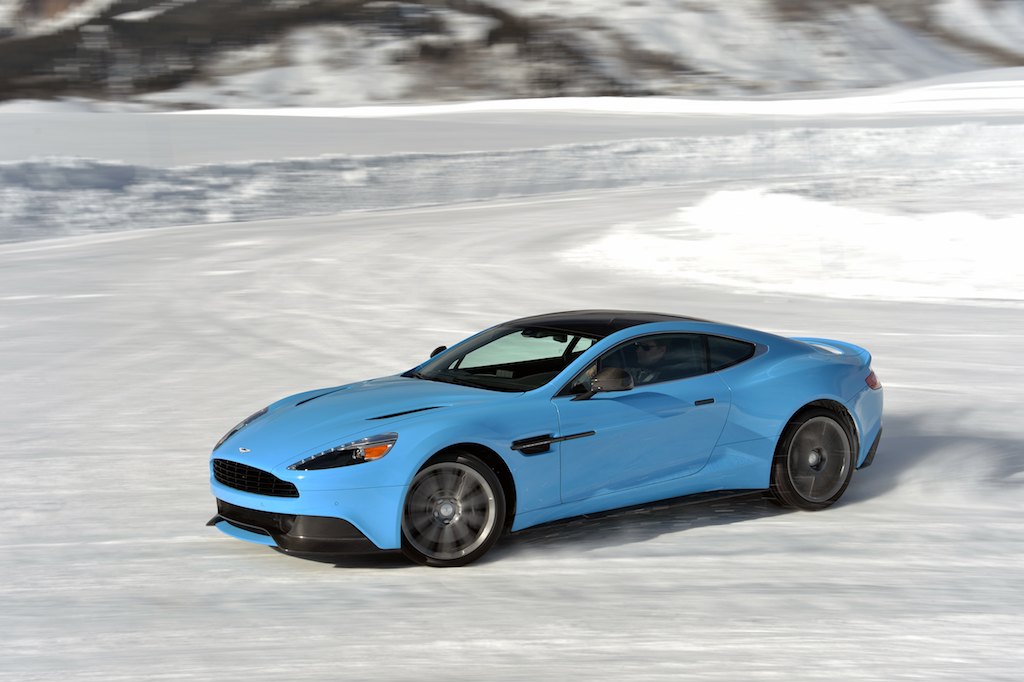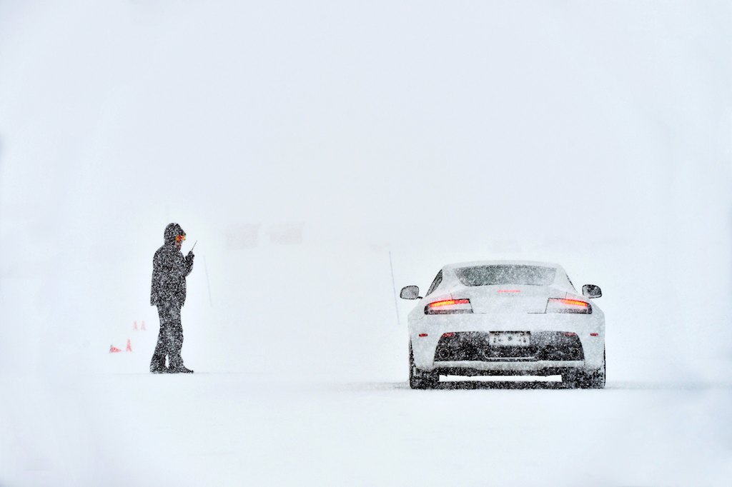 Driving on ice is a thrill, but doing so in a DB9, Rapide S, V12 Vantage S or Vanquish is something of a curiosity. Rear-wheel-drive cars are generally considered the worst winter performers due to their uneven weight distribution. Astons, however, are different; the front-mid engine position and rear transmission combine to offer an even, centralized core. The exercises also put the cars’ stability control systems to good use, but the real fun began when switching to the lesser-controlled Track Mode and by turning the systems fully off. The low-friction conditions provided ample opportunity to manipulate the gas, brakes and steering to control over-steer and under-steer situations to create controlled drifts.