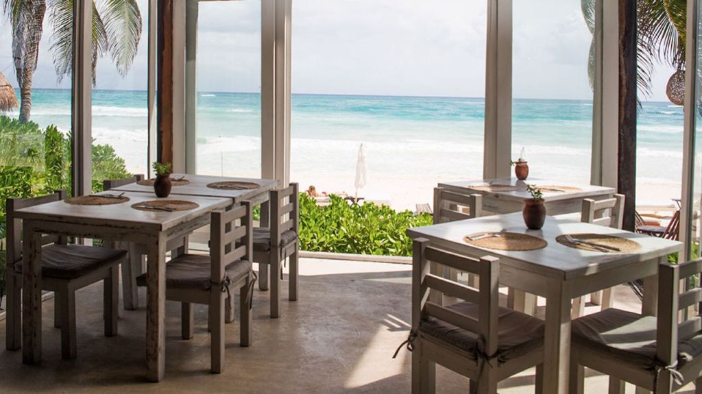 The restaurant’s best design attribute is most probably the floor-to-ceiling windows that open to and overlook the hotel’s private strip of the beach. It’s easy to listen to the Caribbean lap at the shore, under the thatched roof and rustic lighting of the dining room. Seating options range from wood tables to comfy booths and even a curved bar near the kitchen. Far from the louder, scene-oriented venues of Tulum, the restaurant encourages conversation and appreciation for the environment.
