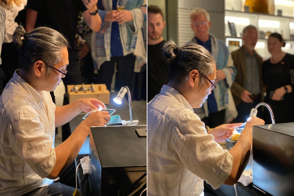 Following our cocktail, we returned to the ground-floor café, which features coffee by Norwegian third-wave micro-roaster Fuglen, and a gallery for the rare opportunity to observe Kiriko glass-cutting. Under the guidance of master Kiriko glass Takumi craftsman, Toshiyasu Nakamura, we took turns carving details into glass using the same method as the Kiriko glass trim used by Lexus in the LS500 Sedan. We were all taken by the amount of strength needed to push the spinning blade into the material—and mesmerized by the resulting patterns.