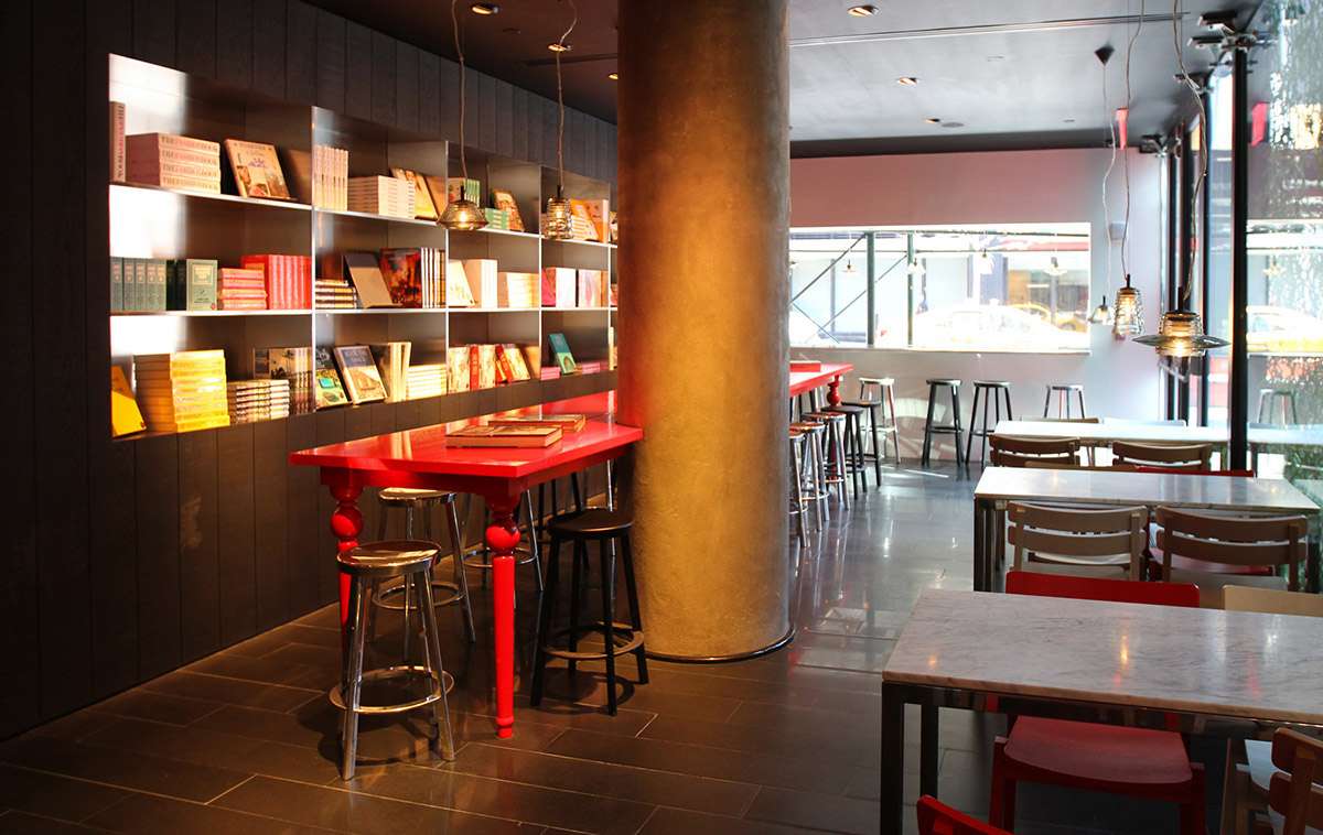 The hotel has a go-to selection of partners that make their brand identity easily recognizable. They’ve been working with Amsterdam-based architect firm Concrete, known for doing the Supper Clubs worldwide and the Mercedes-Benz museum, since the beginning. All of the furniture, aside from some custom pieces, is from Basel, Switzerland-based designer Vitra. And thanks to the shop-in-shop structure at citizenM hotels, beloved Amsterdam-based bookstore Mendo—dubbed “porn for book lovers”—was able to expand outside the country and bring their inspiring selection of creative books to London and now New York. It’s a great alternative to gift shops that sell tacky or overpriced souvenirs.
