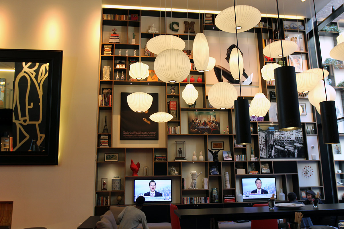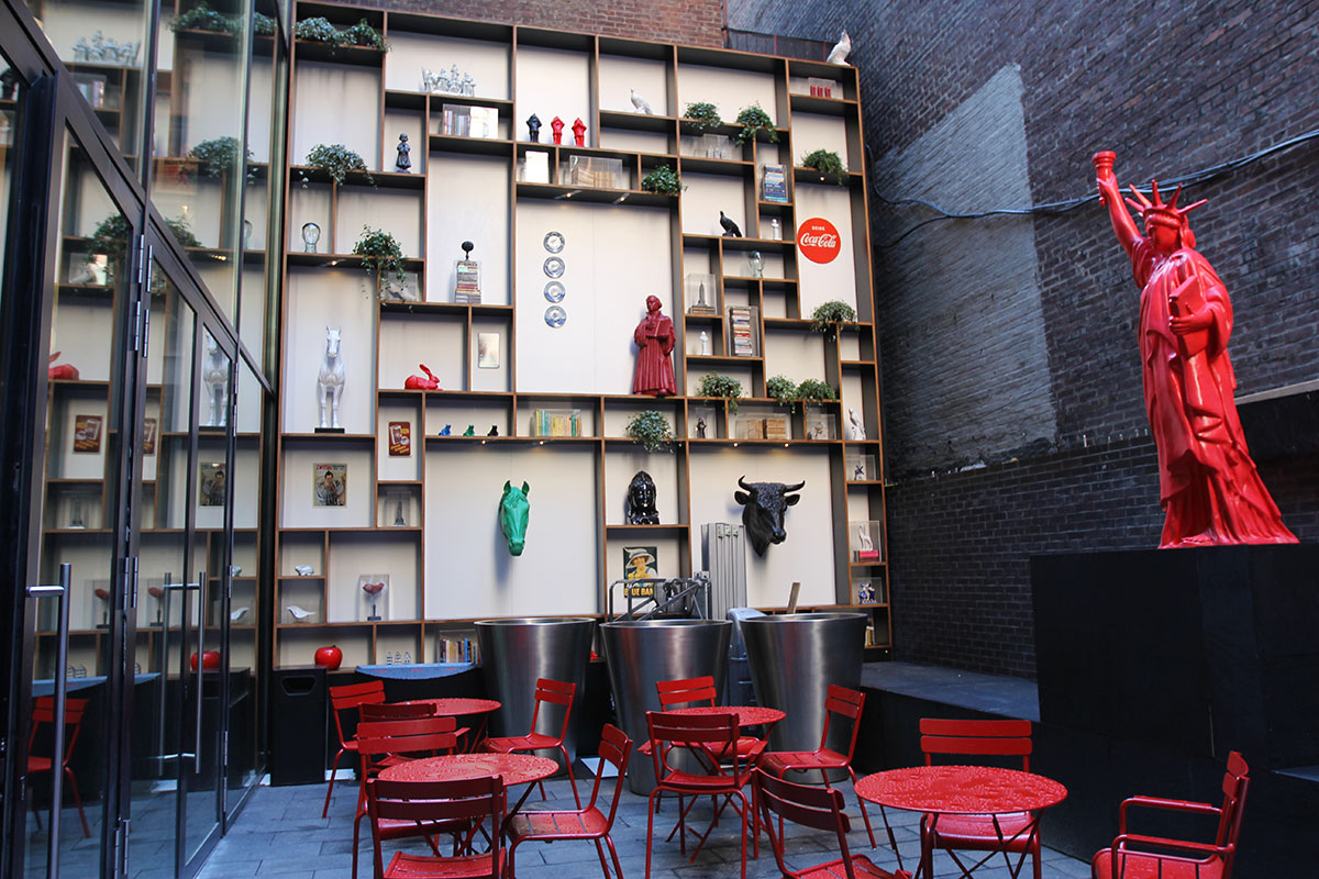 Every citizenM hotel has a mix of commissioned artwork by local artists—inspired by the location—and also pieces from Rattan Chadha’s private art collection (over 1000 works) on permanent display. For the Times Square location, you’ll immediately see Julian Opie’s signature walking figures drawn in gold leaf; the massive “Walking in Times Square” (2014) wraps around the elevator shaft. By the Mendo bookstore is an Andy Warhol screen-print of Queen Beatrix of the Netherlands; David LaChapelle’s photographic take on Da Vinci’s “Last Supper” finds home between objects from around the world settled on the shelves. Artworks aren’t just limited to the living room area, but even the hotel rooms. On the wall is a framed “art screen”; thanks to a collaboration with Sedition Art, guests can choose different digital art works they want to be shown on the screen, like Tracy Emin’s “I Promise to Love You.” Above all, in contrast to the museum or art gallery experience, the artwork is mean to be inspirational and accessible, making guests feel included and comfortable.