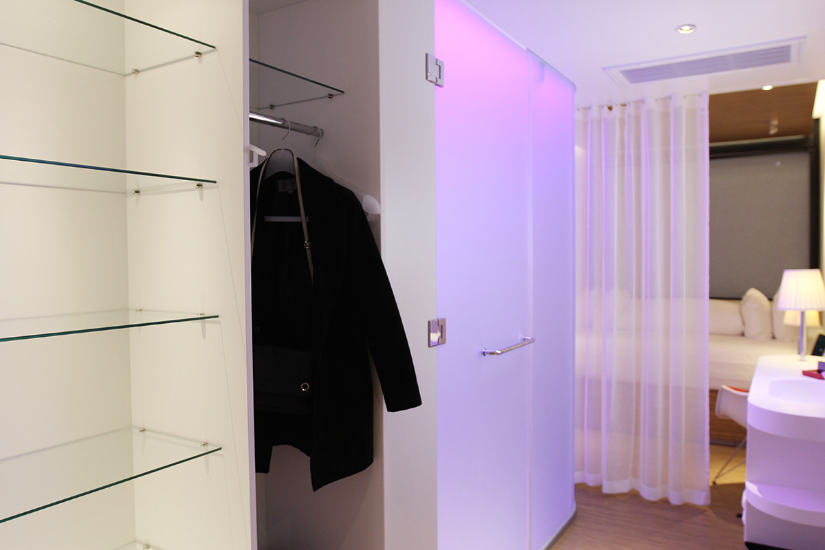 One tablet controls everything in the room—lights, temperature, alarm clock, music and television. There’s even preset moods titled “romantic,” “movies” and “party” that adjust light and blinds accordingly. And, as the icing on the cake, a kill-switch labeled “Save the Planet” is located right by the door and turns off all the lights with one touch.