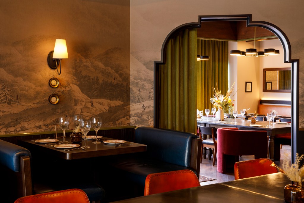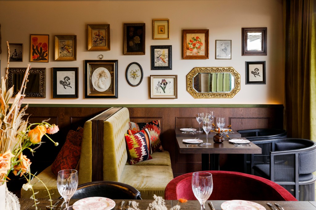 A collection of whimsical vintage objects is featured throughout the hotel; perhaps most impressive is the Victorian three-panel leather screen from the late 1890s, hand-painted in motifs that recall the frontier of the American Wild West. “We really tried to bring a lot of soul into the space rather than taking everything from off the shelf,” adds Bukovec, “and some of the millwork and furniture pieces, like the banquettes and bed frames, are produced in Colombia.” Walls are covered with illustrative textiles, including wallpapers and murals hand-drawn by Lei Xing, an artistic member of the Life House team. A salvaged Victorian-era walnut armoire is tucked into a cozy nook in the lobby area, featuring a curation of goods and apparel from Colorado vendors, as well as candles made with the hotel’s signature scent.