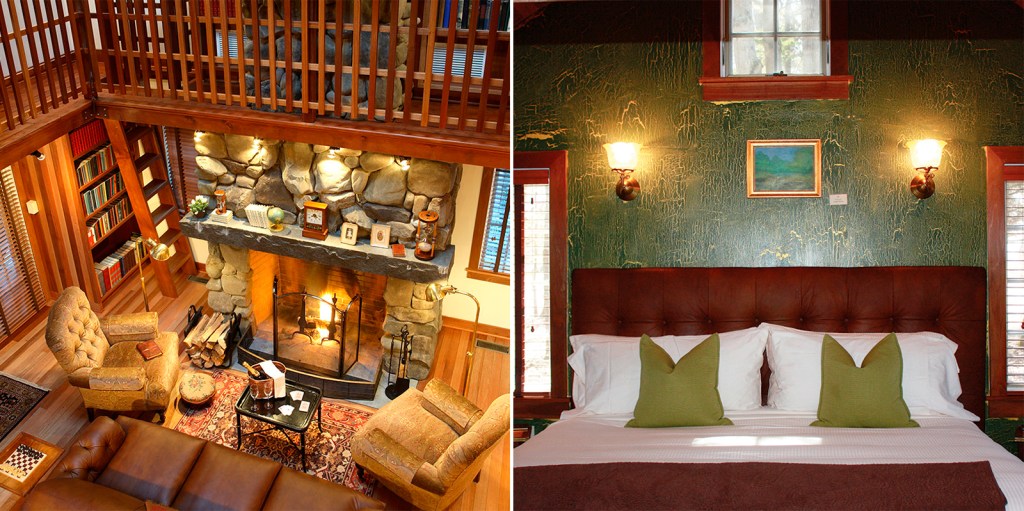 As for Woodlands Cottage, measuring 1050 square feet, “Designer Troy Osborne wanted to make this cottage ‘of the land,’” Smith says. Here, a waterfall rushes just behind the bed and the sinks are hallowed-out tree trunks—some still sprouting roots. The pebbly bathroom floor and stone throughout the living quarters were brought down from Warren, Vermont, near Winvian’s sister property, The Pitcher Inn. A dual-sided fireplace heats both the bed and living room and a steam shower brings the coziness to another level. “It’s a very peaceful, riverside feel,” Smith adds.
