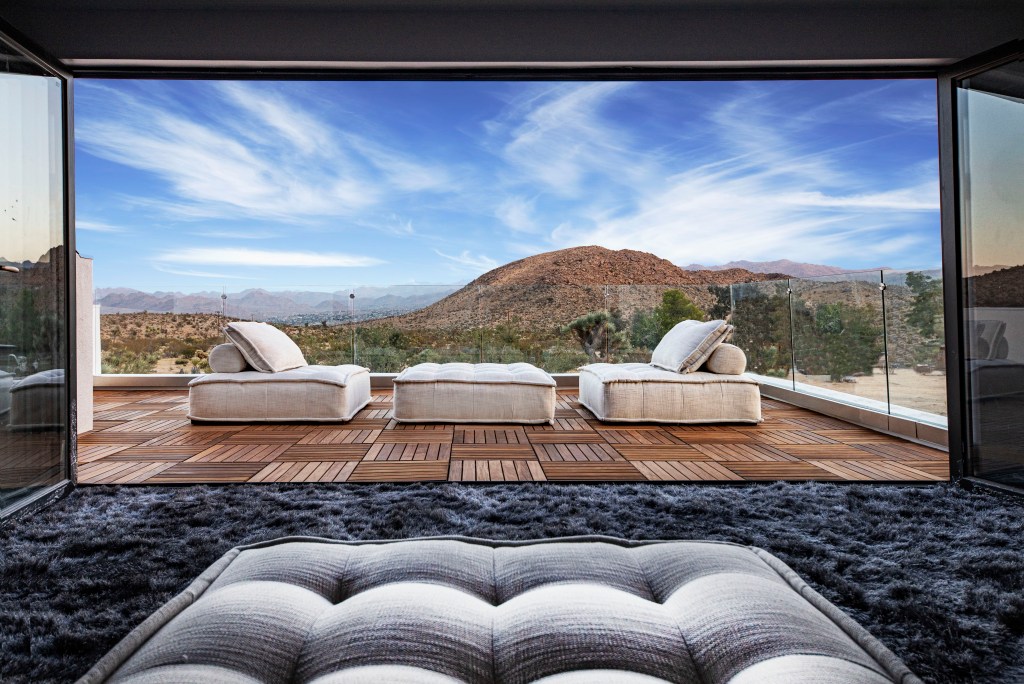 A 15-minute drive away on the other side of town sits the retro-leaning Joshua Tree Country Club—a three-bedroom house just moments from Joshua Tree National Park’s west entrance. This new house sleeps eight, and is just as entertaining, albeit in a decidedly different manner. There’s isn’t a huge dining table here, but guests will be just as happy outdoors, which is a veritable playground. Beyond the patio, pool, jacuzzi, cabana, sun-beds, fire pit and grilling area, there’s a tennis court (which also has pickleball lines), putting green and croquet court.
