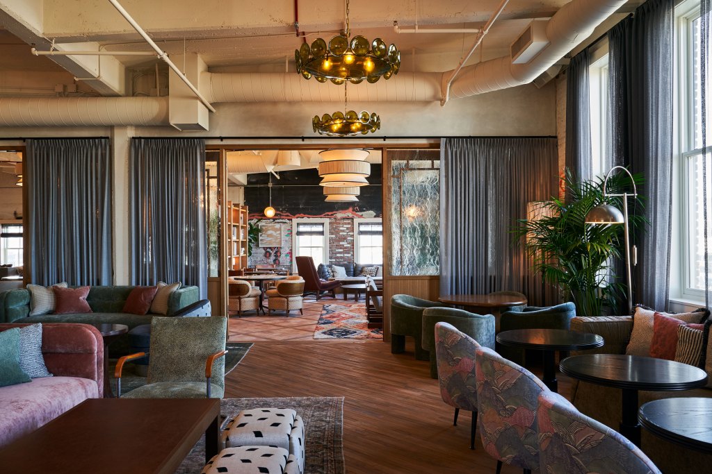This fusion of eras creates a joyful mash-up that the design team was happy to play with. US Design Director Candace Campos tells us that “The windows on the club floor are all different heights and widths, but we found them playful and decided to design art and lighting around these distinct window shapes.” While on the sixth floor, the sloped ceiling inspired the team to hang oversized lighting fixtures as a clever solution to the design challenge.