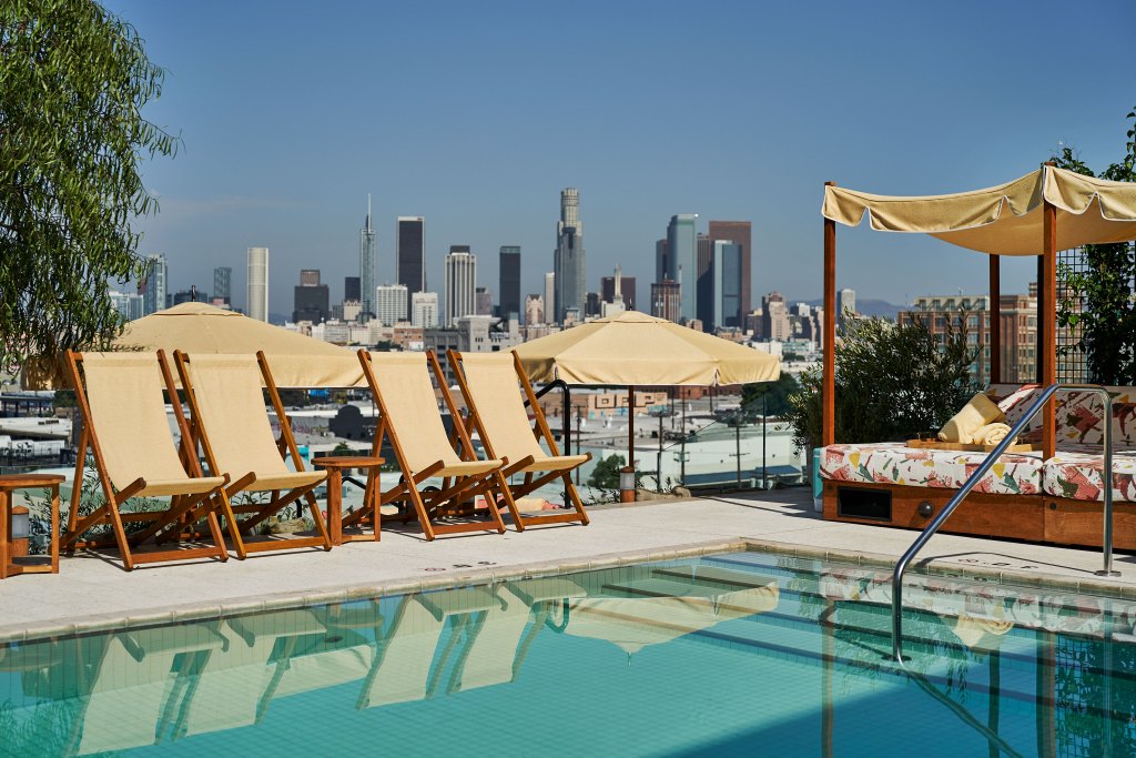 When the brand acquired the building five years ago, one of the first tasks was to design and build out the seventh story in order to accommodate the pool and restaurant. With panoramic views facing west across the downtown skyline, the Roof Garden remains open from breakfast to late-night—whether you’re looking for pancakes or a midnight snack and cocktails. In a practical and playful move, vintage-style coolers dot the perimeter of the pool and outdoor lounge areas for refreshments.