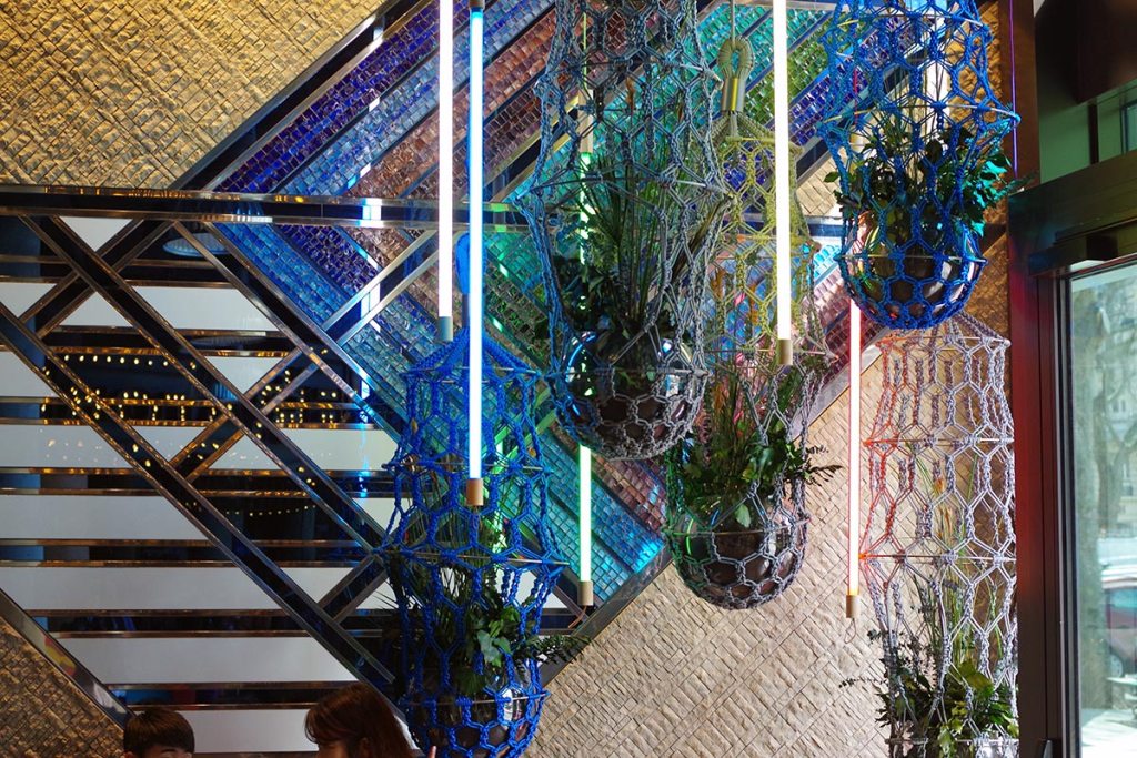 Some of the elements you can spot are antiques Mekhayech purchased from marché aux puces (flea markets), such as the 1970s alien-like street lamps at the entrance or the Gothic chandelier with filament bulbs in the elevator lobby by the bar. The couches in the “Chill Out” communal space were custom made from Turkish Kilim rugs. “This was playing off the more ethnic, more multi-cultural side of Paris—especially in the 10th,” says Mekhayech. “That was really the inspiration for this floor. Each area has its own little flavor.”