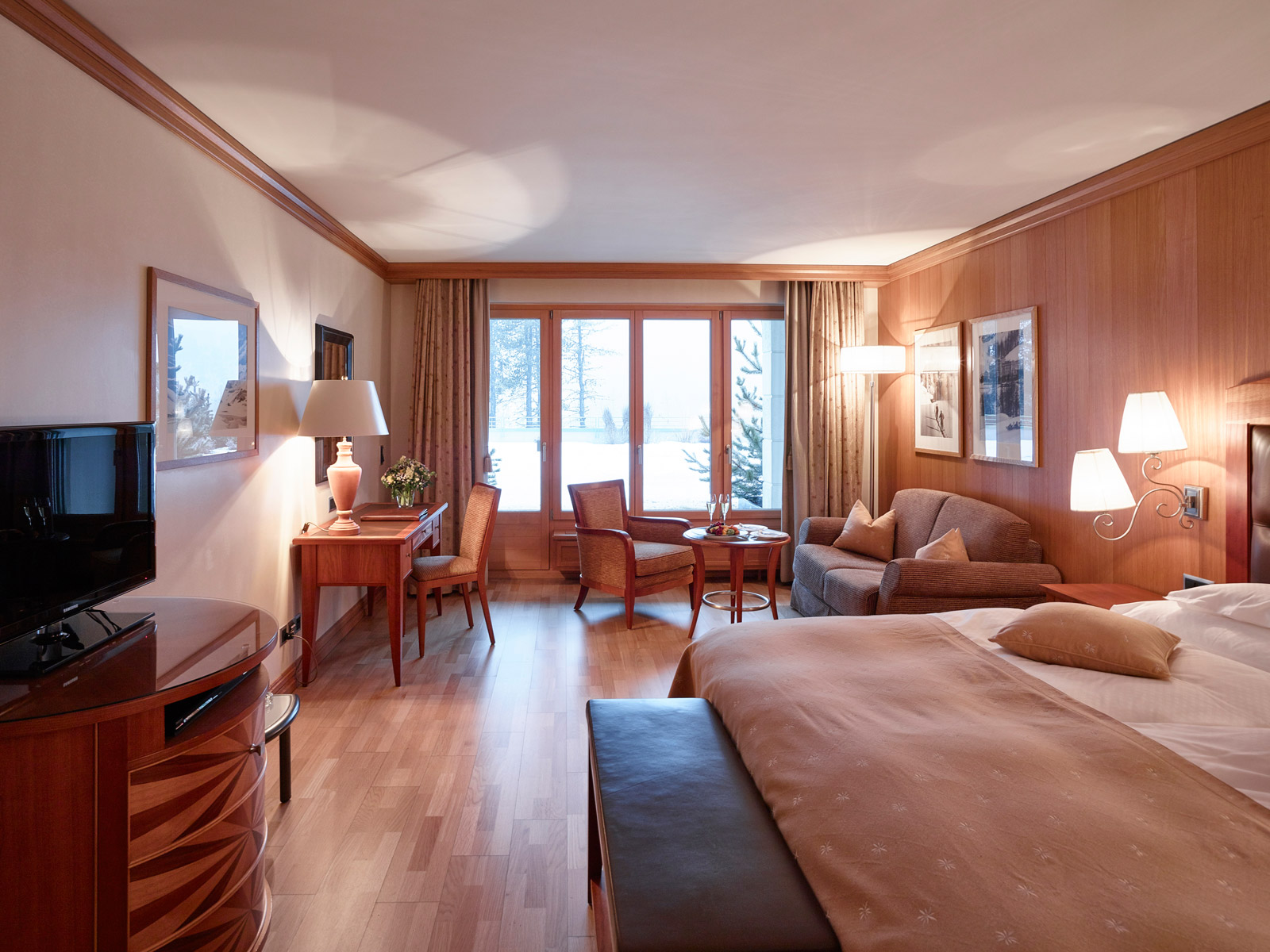 We mentioned the price for single rooms upfront, because the very name Grand Hotel Kronenhof might sound daunting. Understandably, with a larger budget rooms grow in grandeur. There are spacious double rooms (pictured) with traditional Swiss pinewood paneling. There are also two categories of junior suites: Grand Premium and Grand Classic. The former are the result of a 2016 renovation by French interior designer and architect Pierre-Yves Rochon. All of the junior suites are south-facing and most feature either a balcony or terrace. As far as suites go, the Kronenhof has nine and each is uniquely decoratedwith the decor pertaining to its location in the building and its views.