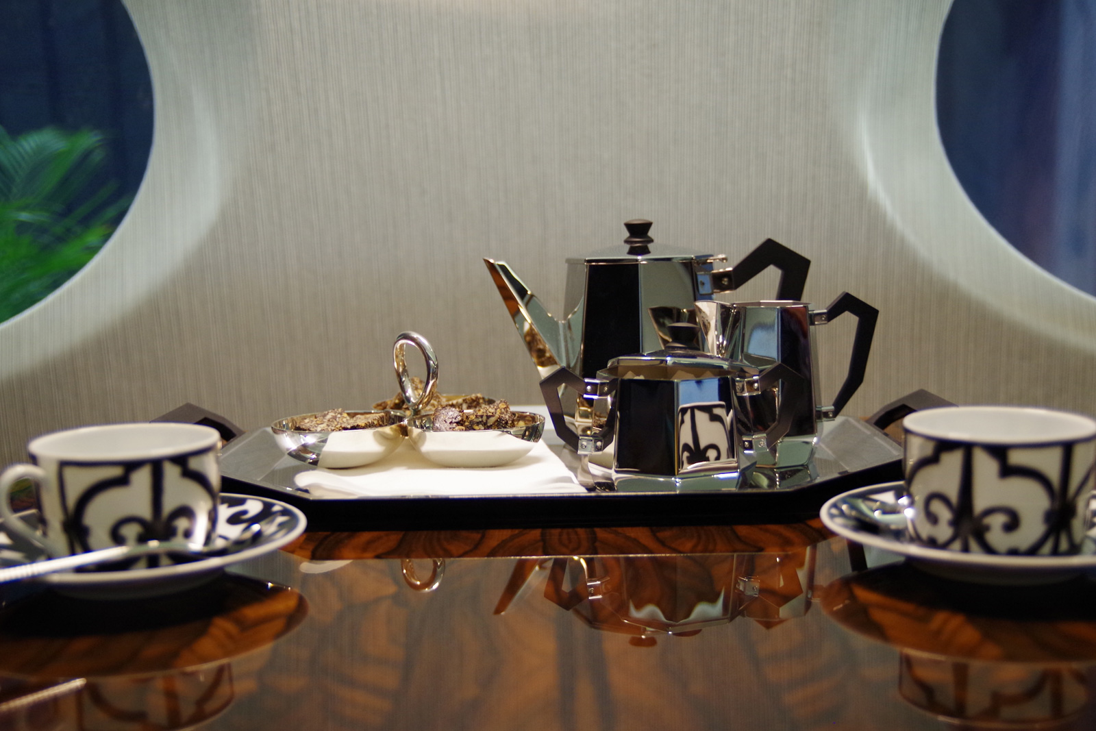 While color options abound for the walls, veneers play an interesting role. These accent details and table tops are in actuality thin slivers of real wood, drawn from 100 logs kept on site. They are cut so slim that there is almost unnoticeable variation between sheets drawn from a certain range. Rare woods accompany more common woods, and classics are shown along with statement pieces. All veneer cutting and finishing is done on site. In fact, all of the jets’ finishing is handled on site, down to the placement of carpets (customized, or from likes of Tai Ping) and wares (with Hermes, Lalique, Baccarat and Christofle as popular options). Details down to the stitches are all conceived in advance, so that customers (utilizing a 3D-viewing app) can see if their desires work well together.