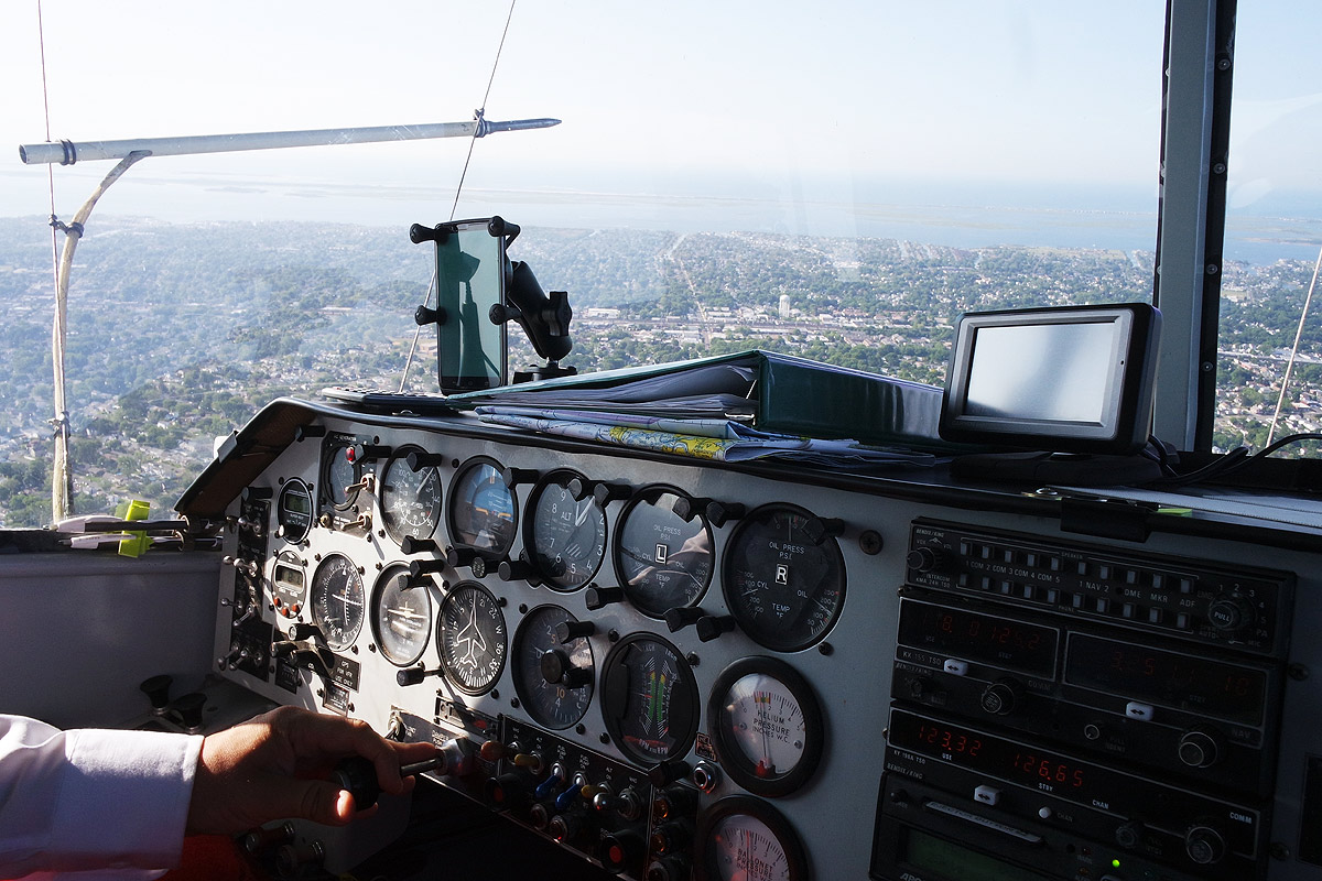 This particular airship maxes out around 35 miles per hour, though with a strong tailwind can approach 40 or so. Cruising altitude—a delightful 1,000 feet up—is achieved in under three minutes. There, with windows open, it smoothly sails, wobbling only for a strong gust of wind. With the flight instruments appearing as a relic of the past, and the steering wheels actually falling at either side of the pilot’s chair (and supported by two foot pedals) it’s a distinct, timeless experience.