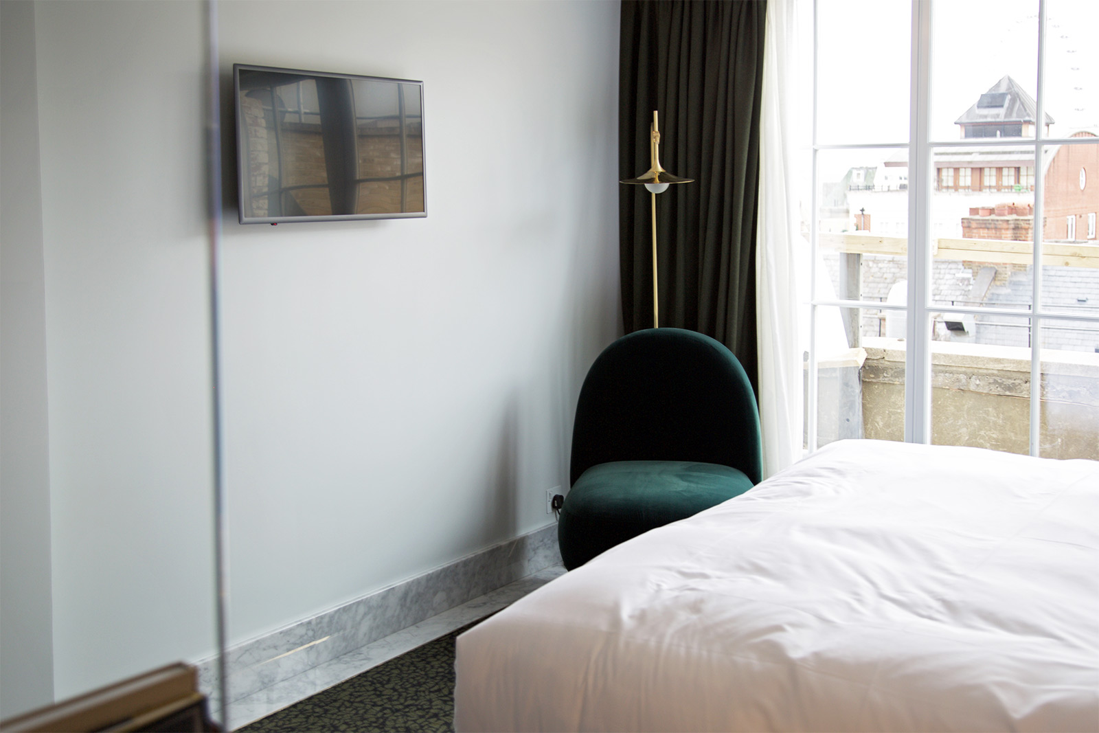 Inside, top to bottom, Dorothée Meilichzon—the 2015 Maison Objet Designer of the year who has left her touch on most of the newest boutique hotels opening in Paris—does the most in the hotel rooms, which are on the smaller side. Her elegant design surprises in subtle ways, without ever being cumbersome: the statement-making, custom-produced headboards center the room. A floating wooden closet hides the mini bar. Two vertical split doors open into the bathroom like French windows. The marble edges of the room meet a patterned green carpet in the middle. There are no door knobs on the front door—you open with the old-fashioned metal key and by pushing. The top rooms on the 5th floor each have their own balcony and the view of the London Eye is a continuous reminder that you’re in this city, not anywhere else.