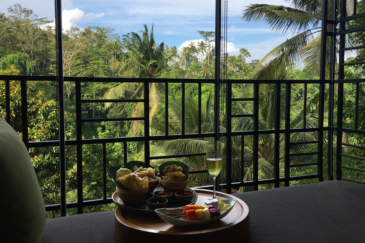 With rows of verdantly waif-ish palm trees swaying ever so slightly in the foreground and the sound of utter silence surrounding you—apart from the occasional jungle chirp—it’s easy to feel suspended in another universe while unwinding in one of Hoshinoya Bali’s intimate sky gazebos. The seven protruding structures, which can be left open-air or have the shades drawn for privacy, are like cliffside birdcages that immerse humans in a unique arboreal experience. Simply remove your shoes and step inside.