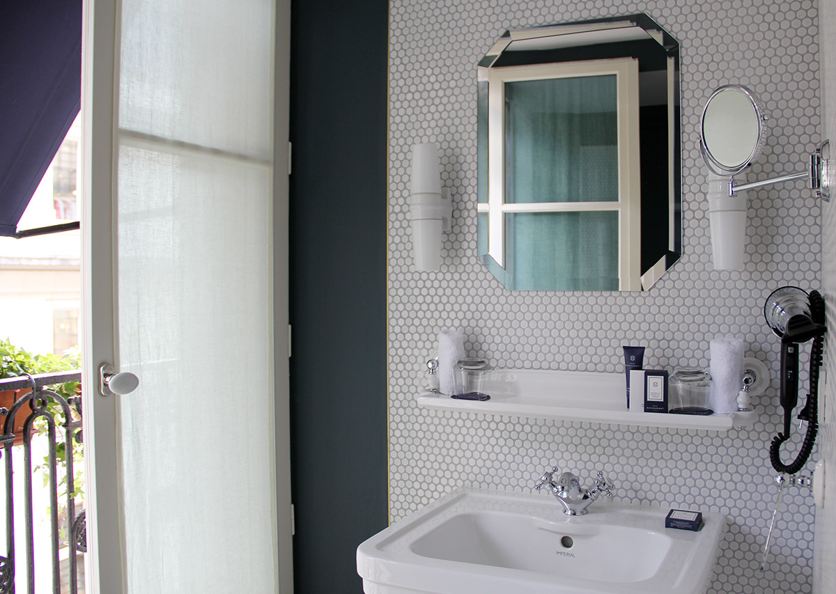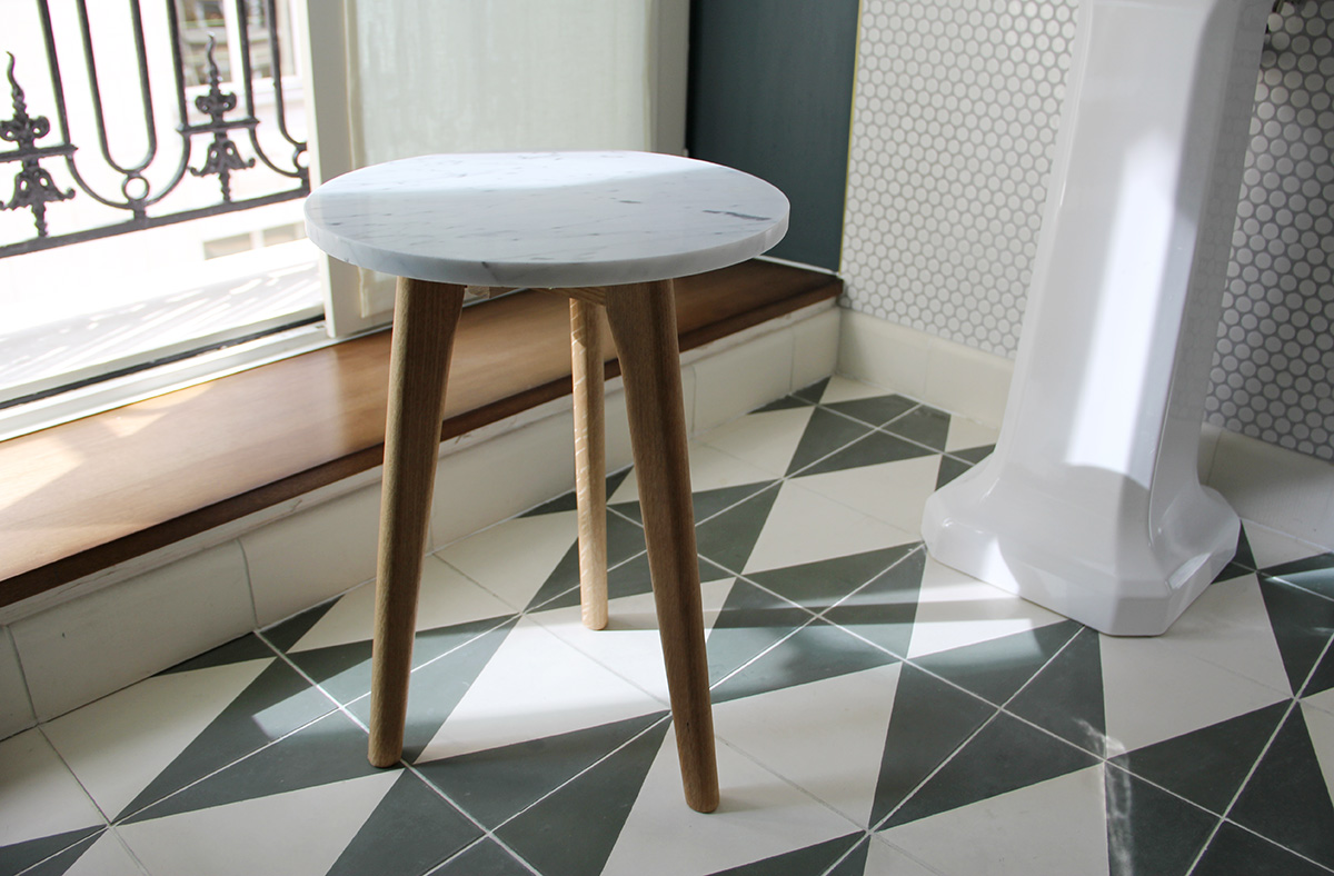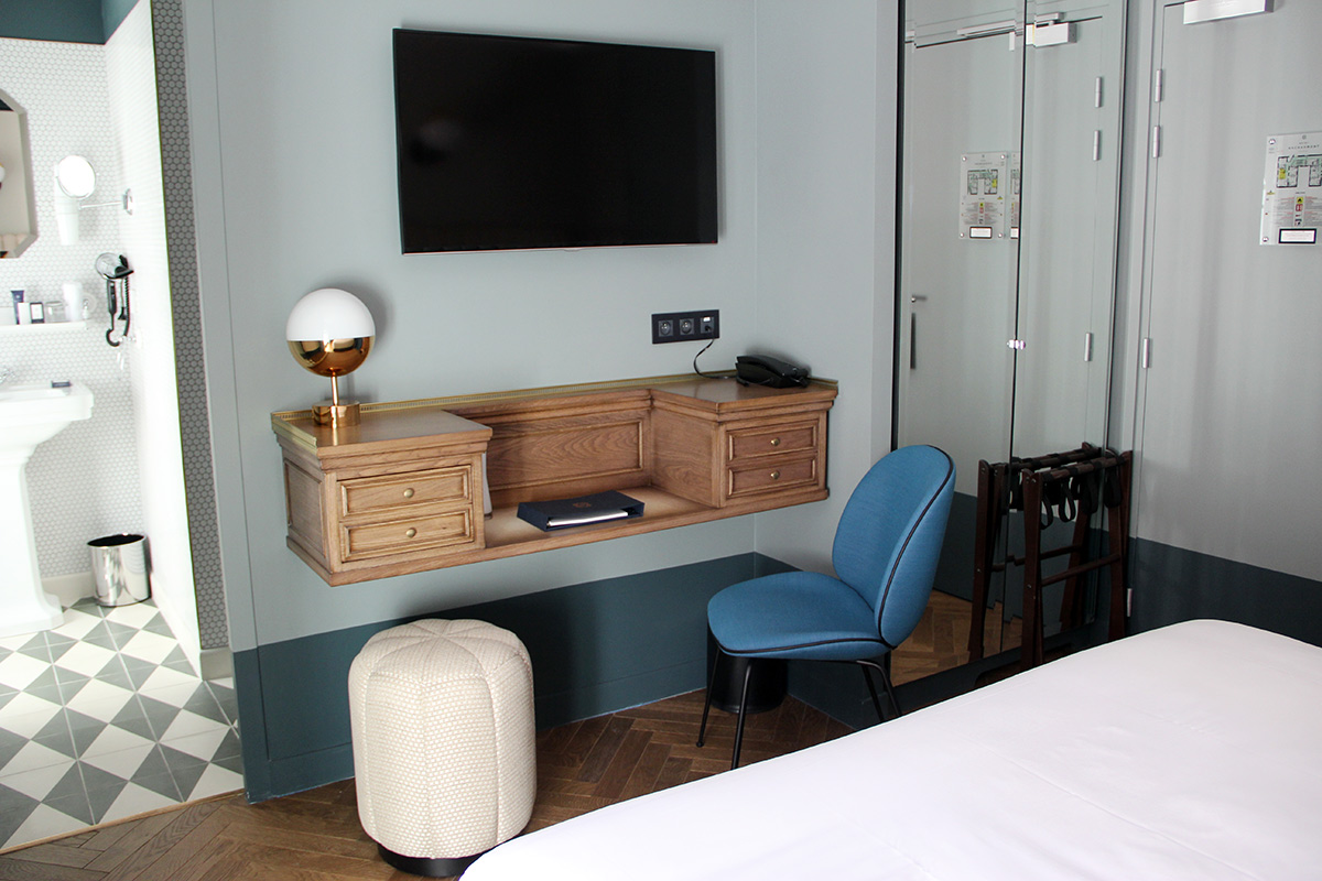 Fabric headboards and colorful geometric tiled floors are becoming Meilichzon’s visual signature and manifest at Hotel Bachaumont. There, minimalist furniture pieces—beautiful marble side tables to skinny legged chairs—all help add more space to the Parisian-sized rooms. For those wanting to celebrate something special, the four different suites offer a fantastic view of the city.