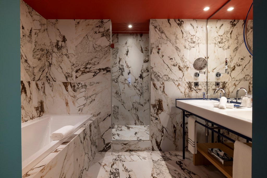 There are eight distinct categories in the hotel’s 108 rooms, each suiting the needs of different travelers. Unlike boutique hotels operated by big chains, the focus at Bel Ami isn’t on big suites supported by generic smaller rooms. Room layouts are as functional as they are creative, with desired amenities—such as USB-C and USB outlets—where you expect them to be. One appreciable luxury is the ability to connect certain adjoining rooms—and nearly an entire floor by combining apartments and room types. If you travel with a sizable entourage or whole family, as some of Bel Ami’s returning guests do, this is the key to a home-away-from-home atmosphere. There is of course a beautiful top floor suite that has the look and feel of a Parisian artist’s studio, where we would have happily signed a year lease on our dream Parisian pied-à-terre had the offer been on the table. It’s a testament to the design refresh throughout the hotel that makes it feel so intimate and livable—previously it felt more distant. Funky has been replaced by chic, but the design language is by no means contrived. Pops of deep blues, rich reds and faded greens still accent rooms, but the neutral earth tones underpin the elegance that’s found behind each chamber door.