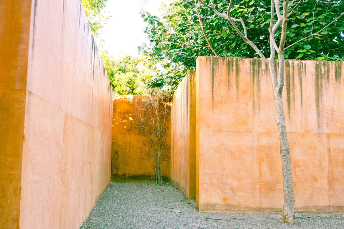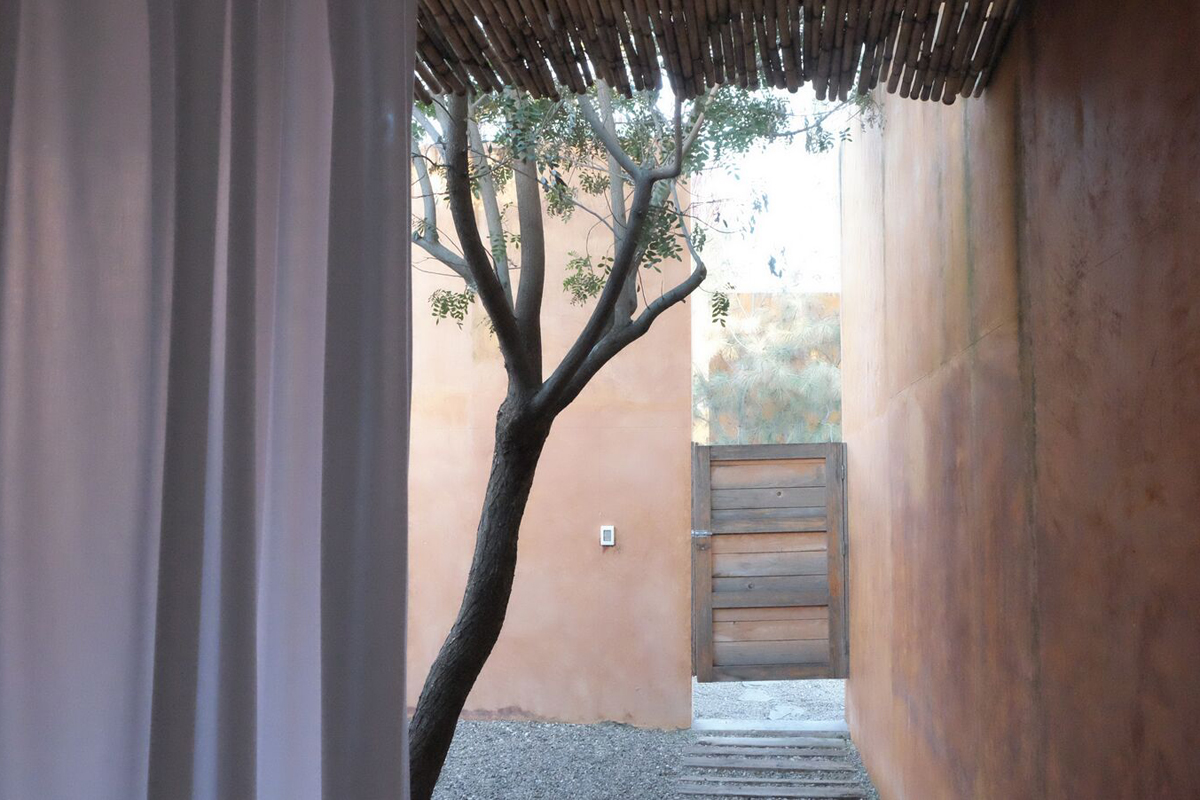 Through the entrance, a tumbler of delicious local mezcal and a series of looming fire colored walls awaits. These walls (inspired by the nearby pre-Hispanic maze found in Yagul) unfold throughout the hotel bordering each of the rooms. The deep, earthy organic paint used on these towering walls is a hotel secret but the overall effect is of being on a hospitable Mars, mirroring the landscape of the region.
