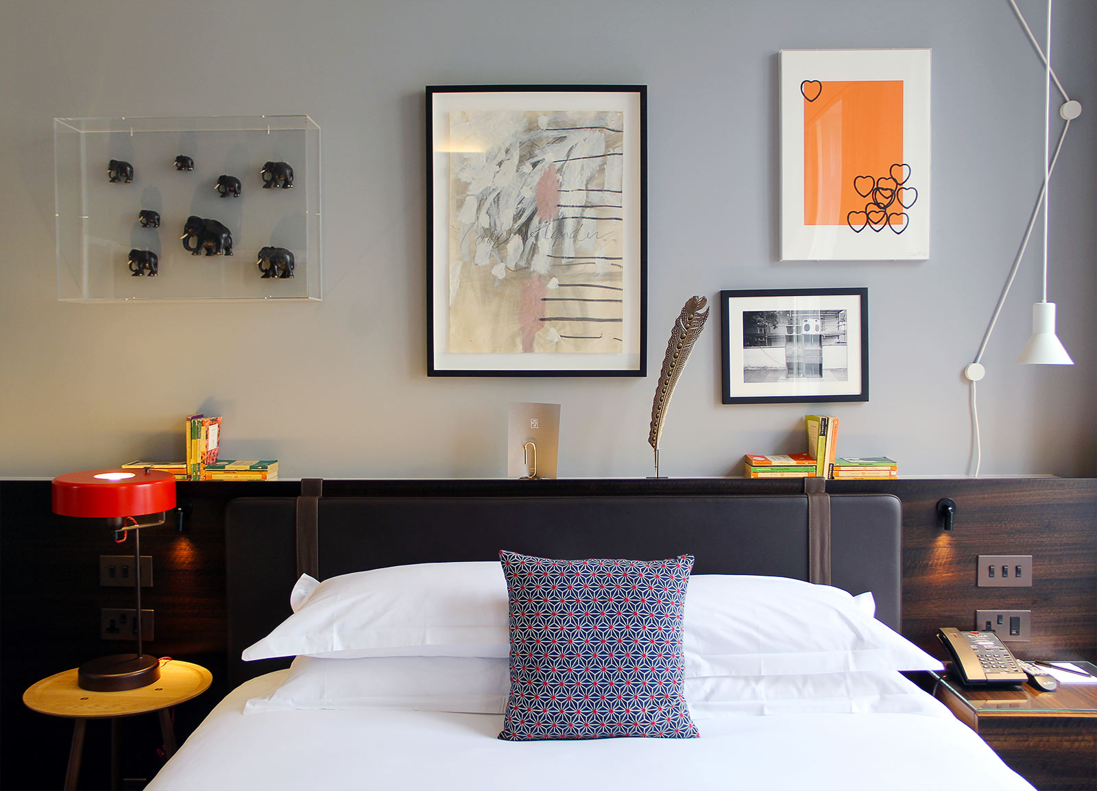 Throughout the hotel, the interiors quietly celebrate British talent and history. “We combined modern British furniture and Portobello finds, placing them in modern rooms of restored stucco elegance,” notes Lowy. The different lamps were handmade in Haggerston by one-to-watch Simon Day of Nocturne Workshop, including his newest design for 2016, the Gil (named after Gil Scott Heron, as all of his pieces are named after singers) with a hand-spun aluminum shade. The bedside table and benches come from South London-based studio Pinch; in the dining room, visitors sit on BA chairs, a 1945 design by Ernest Race.