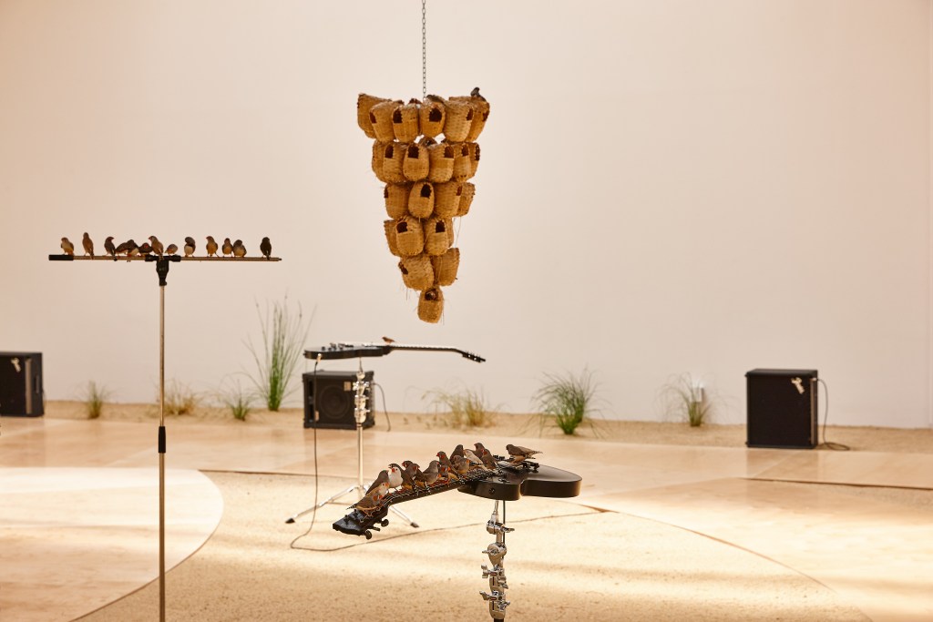 HAB Galerie, which is located in one of the old banana storage hangars (yes, really) on the formerly industrial island Île de Nantes, is showcasing four of Boursier-Mougenot’s works. The most captivating one is “from here to ear,” which was originally made for Nantes in 2009. It features 100 zebra finches in a large indoor birdhouse, filled with cymbals turned into feeders and drinking troughs, as well as 20 electric guitars that the birds rest on, happily picking away. The sound of the birds and the instruments they “play” are transported around the room via speakers, and the experience is beautiful, absurd and meditative at the same time. HAB will host the exhibition until September 30.