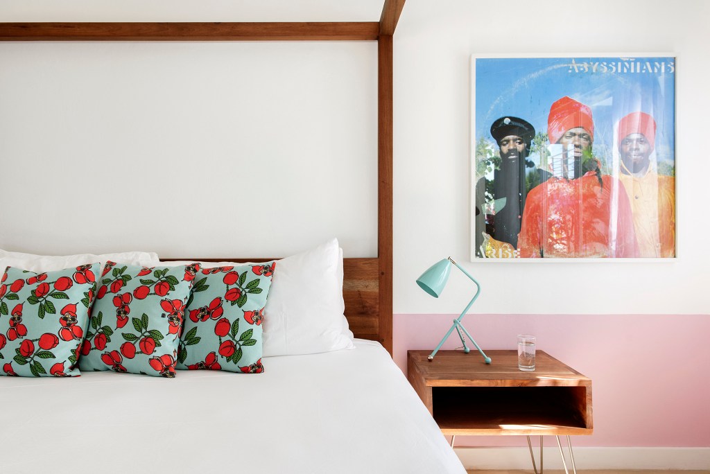 While the whitewashed concrete and geometric breeze-blocks of the building are naturally contrasted by the flourishing green foliage all around, the colors inside were also chosen to reflect the natural palette of the country. “The property’s design is defined by an authentic sense of place—from aquamarine guest room doors that convey the boutique hotel’s proximity to the Caribbean Sea, to various shades of greens reflecting the property’s lush native vegetation, to accent pieces showcasing the island’s signature ackee fruit’s bright red color. Additional inspiration for the color palette and wall prints are taken from the vibrant houses, painted stone, and signage found throughout Negril’s West End,” Salmon says.
