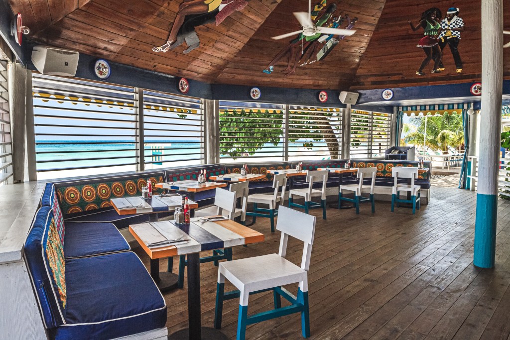 The aforementioned path from reception also leads guests to the pavilion (where parties and yoga, cooking and painting classes are held), on to the beach, and to the Negril outpost of NYC’s darling Miss Lily’s. While this iteration is open-air, the restaurant is just like its counterparts in New York—with a laidback party vibe, tropical cocktails, Jamaican dishes, and a focus on music and the local sound-system culture. Salmon says, of the Serge Becker-designed space, “Central elements are the speaker-stack bar and the Skylark DJ booth with its wall of historic ’70s and ’80s reggae album covers paying homage to the country’s musical history. Local artists adorned the ceiling with a mural of ’80s-styled dance characters. Grandma’s flowered enamel plate collection is fashioned into lighting sconces and nautical navy and white piped upholstery is adorned with African fabrics. Moroccan tile outdoor tables are complimented indoors with brightly painted local timber chairs and tables crafted at the nearby Rockhouse woodwork shop.”