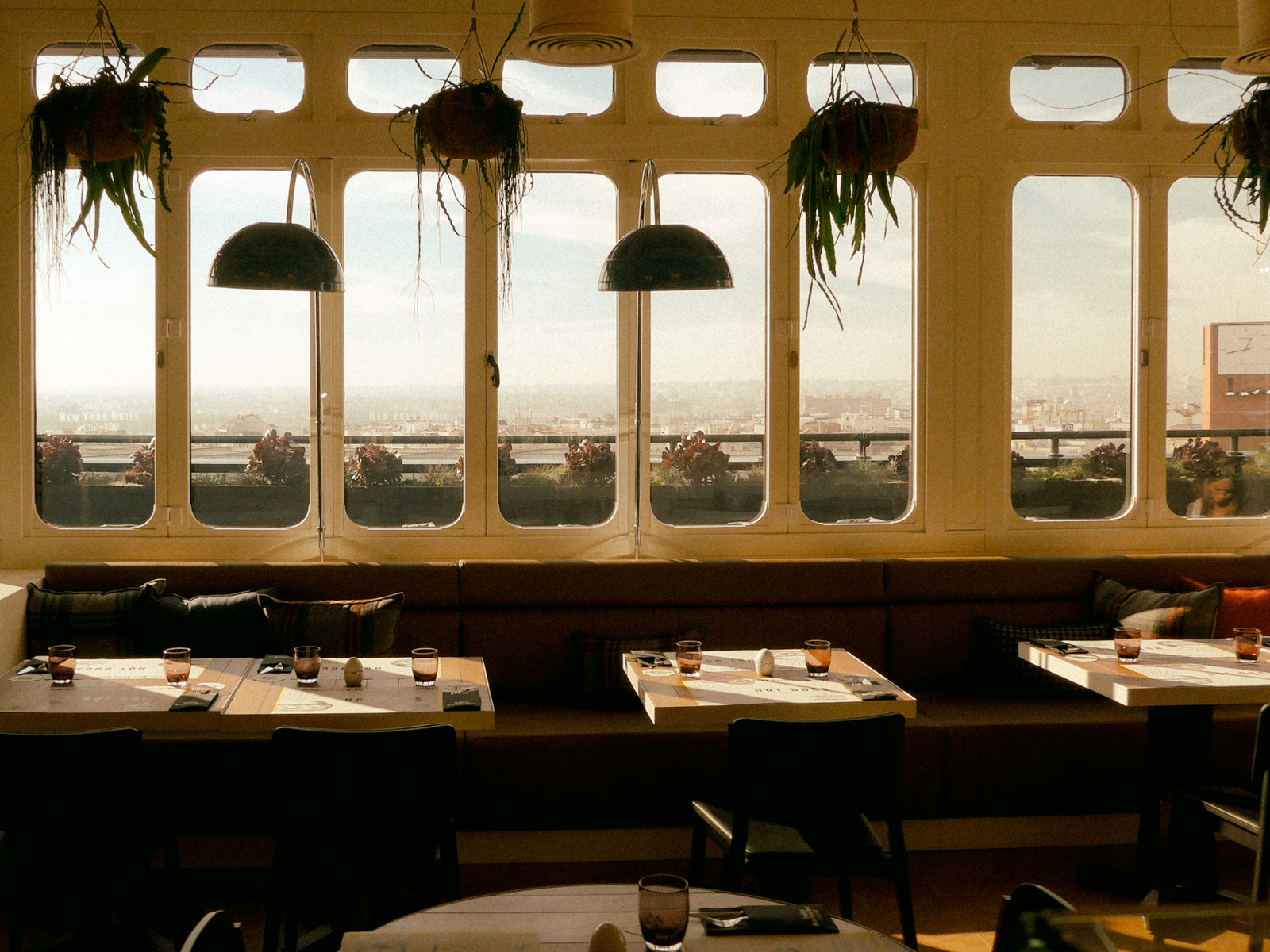 Throughout the hotel, various endearing touches are apparent; from the cozy plaid blankets in the bedrooms to light-box signs and various textures in every space—differently patterned tiles, exposed brick, wood. After our stay in January, just a few weeks after the hotel’s opening, we spoke with Lázaro Rosa Violán, the designer who took the long-abandoned building and made it warm and buzzy, without it being overwhelming. He says the client was looking for something unlike their other Madrid location and wanted “a sporty, fresh, and urban feel.”
