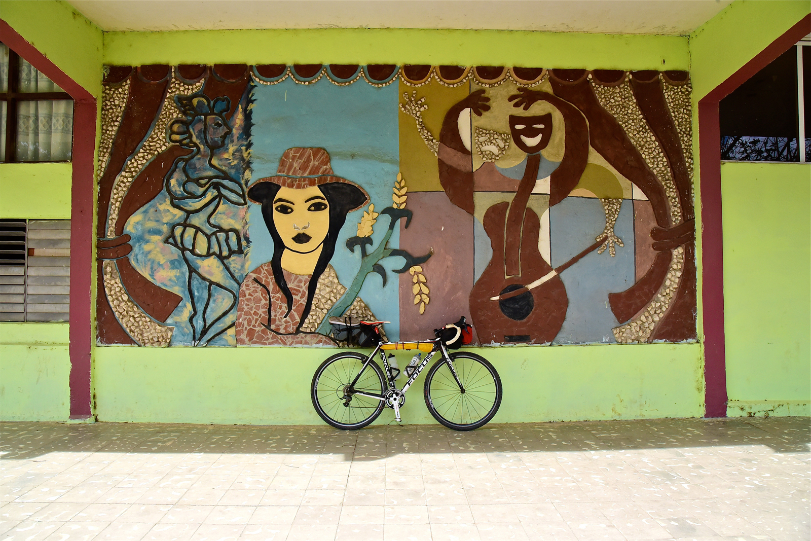 Most of the art we saw had to do with the revolution and Fidel, so this piece was interesting. My rig was a standard Cross Bike loaded with front and rear bags and my tent poles and stakes strapped to my top-tube.
