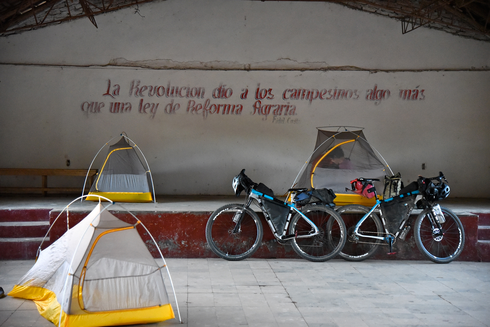 This was by far the most interesting night we had. This shelter was the performance center of San Antonio, in the center of town. A local guy had the key to the gate and let us in to sleep there. The locals were very curious about us and watched everything we did. When we went to sleep, a nearby party turned into a full on raging fiesta all around us until about 3:00am. It was one of the loudest, most spirited street parties I’ve ever heard. Locals sang on the PA System and were really good. But it was so loud: we could not see anything but just hear this madness all night long. People yelling, horses galloping, music cranking, it was kind of crazy. When the music finally stopped, an infinite number of roosters screamed until day break. They were everywhere around us. I had never heard anything like it. We got zero sleep and came out of our tents laughing. The entire scene was ridiculous. It was all great to be honest. Quotes from Fidel like the one on the wall behind us were everywhere across Cuba.