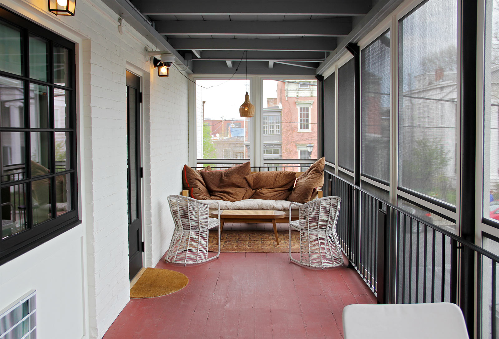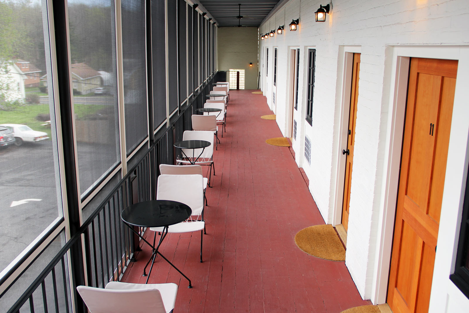 In the standard-sized rooms, guests will find no closets or bureaus (there’s a rod to hang jackets). All one needs in life is a bed, a comfy armchair, a Bluetooth Marshall speaker, and a shelf to place keys and wallet. The visual message is: leave all your stuff behind at home and lose yourself here. Some of the rooms on the second floor (including ours) run along a screened-in patio in lieu of a carpeted hallway. We loved leaving the front window and door open to let fresh, dewy Hudson air and sunlight in—though at night, cigarette smoke drifted in from the parking lot. The hardwood floors uniquely continue into the bathroom; no tile here, except in the shower. The bulk-sized amenities are made by musically inspired botanical perfumery 2 Note (whose store is a 15-minute walk from the hotel). Also worth pointing out are the fabric fire exit signs, screen-printed by a friend, and the extremely spotty Wi-Fi.
