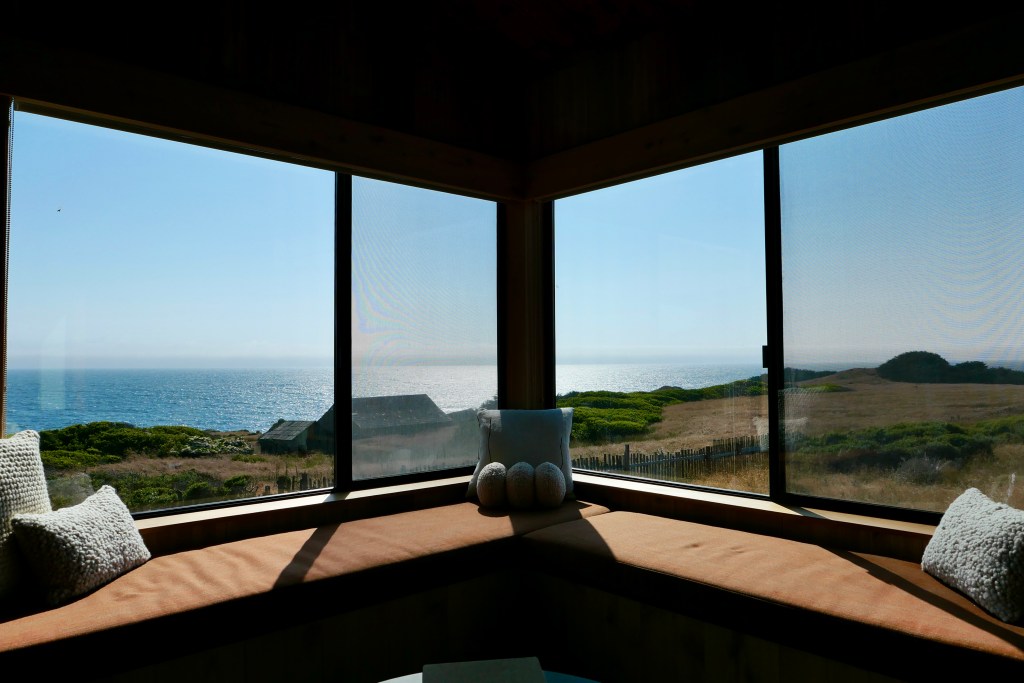 The low-slung wooden structure melds into the landscape. Mailboxes for locals flank the front of the building. Once inside the doors, a bold Solomon red arrow supergraphic is painted on a wall near the gift shop, which is teeming with design books, comfortable sweatshirts and a refrigerator filled with California wines. Rotating art installations, curated by local gallerists Maynard and Lu Lyndon, are on display by the coffee bar. Venture further to find the lounge, restaurant, cocktail bar—and the view. It’s majestic, and reveals one of the many reasons why travelers venture to this rural area of the Golden State.