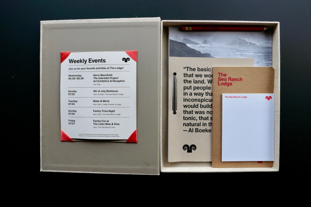 In each home, the hotel’s history is displayed in a covered linen box on the coffee table, featuring a quotation from The Sea Ranch founder Al Boeke that reads, “The basic notion is that we would respect the land. We would put people on the land in a way that they were inconspicuous. We would build architecture that was not architectonic, that seemed natural in the place.” Boeke, a visionary who collaborated with architects, landscape designers, planners, artists and environmentalists, developed the area in the ’60s as a collaborative utopia. This ambitious dream is currently the subject of an exhibition at the SFMOMA, entitled The Sea Ranch: Architecture, Environment, and Idealism.