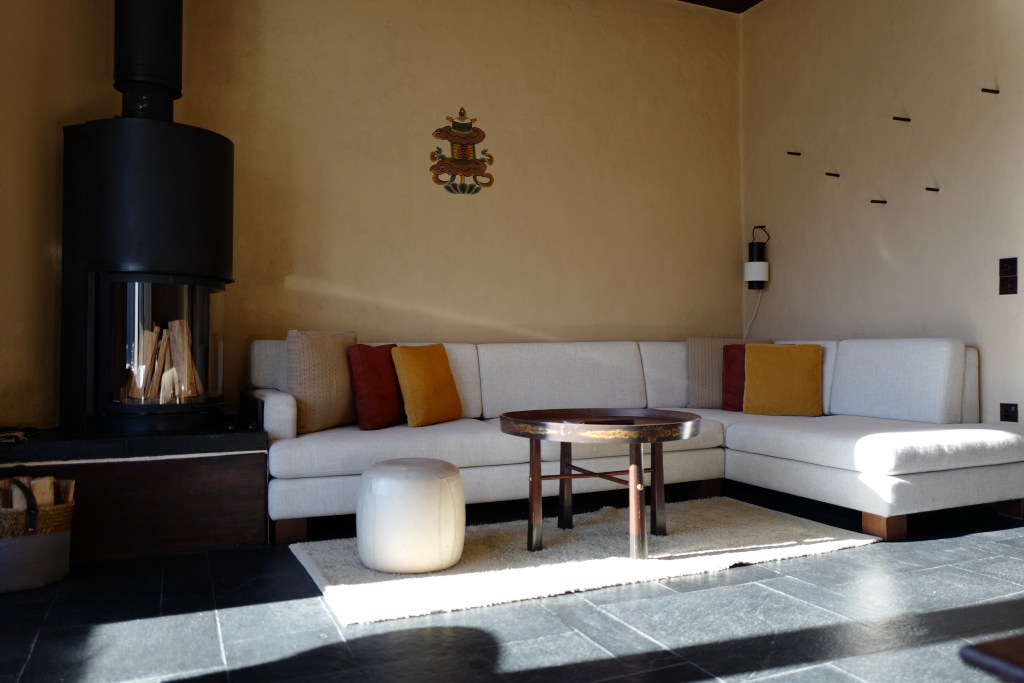 Upon approach, the edifice of Gangtey Lodge hints at the monastic design found inside, delicately blended with farmhouse aesthetics. Rich wooden accents and structural components compliment layered stone and white walls. An all-glass wall in the lobby, dining room and common area (one joint space) separates inside from out. Fireplaces intermittently divide this partition—the flames are visible from both sides. The back porch offers exquisite, peaceful views down into the valley and up toward the hills. Out here, one can take breakfast or simply sip tea. Blankets and neck warmers are brought for guests during the colder months. Binoculars are on tables and a brass telescope stands in one corner. It’s quiet, spacious and accommodating—and one of the hotel’s irreplaceable standouts.