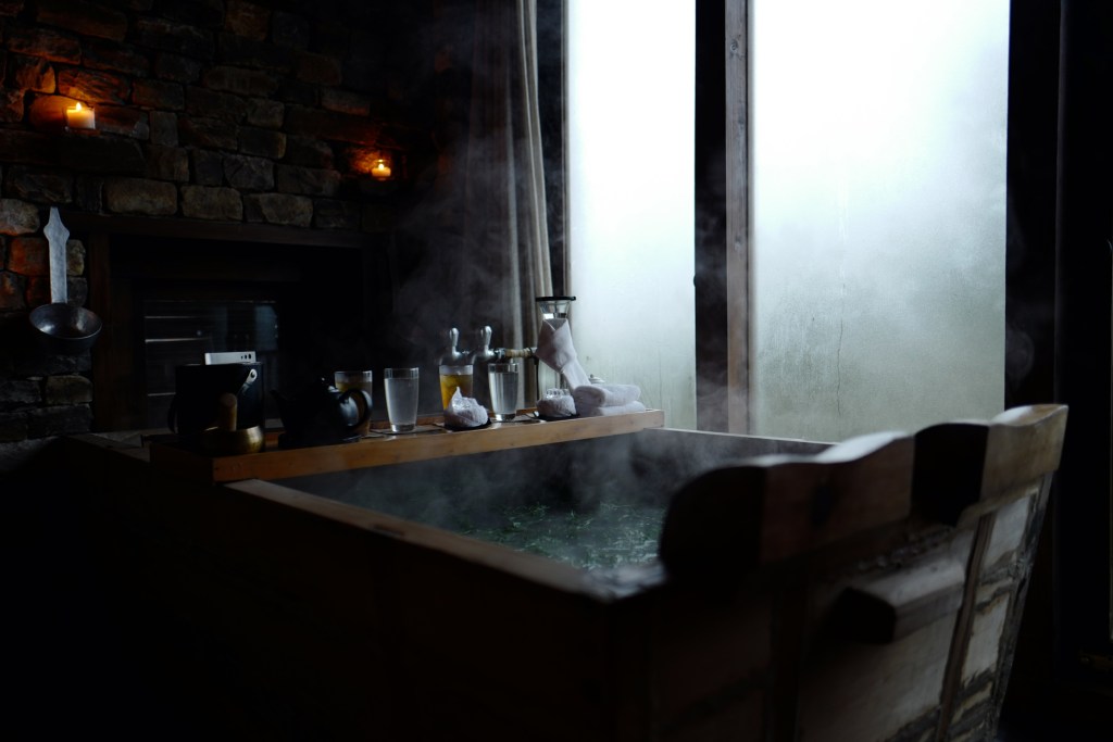 Perhaps the most luxuriant amenity, the docha (or traditional hot stone bath experience) involves roasting local river rocks over an open fire for hours and then depositing them at the foot of a local pine wood tub. There, they heat the water, as well as fronds of the herb artemisia. Guests (one or two per session) then soak alone in the medicinal water, known as menchu. Iced tea can be found in the room, along with ice water and small, sweet bites. It’s private, relaxing and recommended after a massage—which happens one room away.