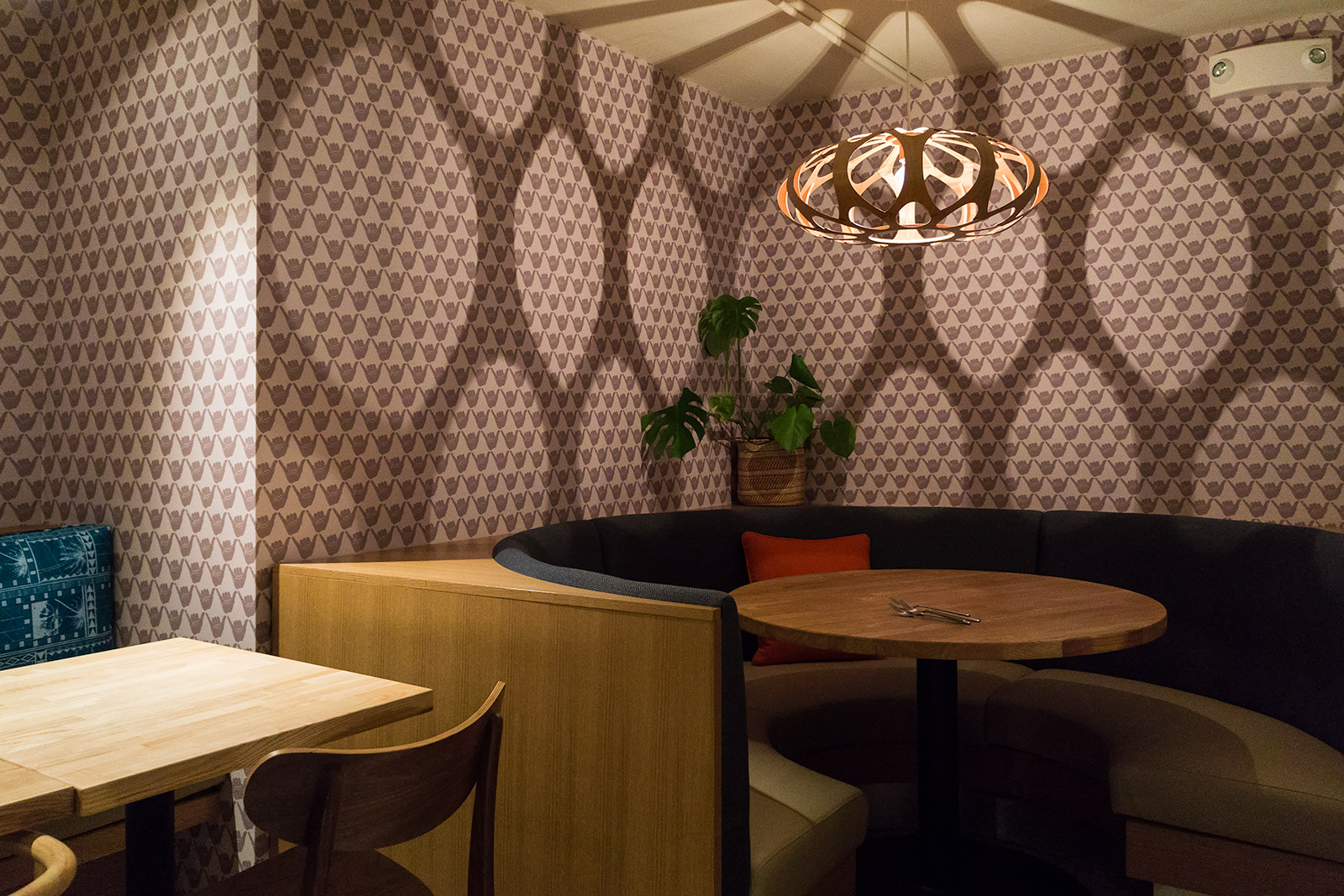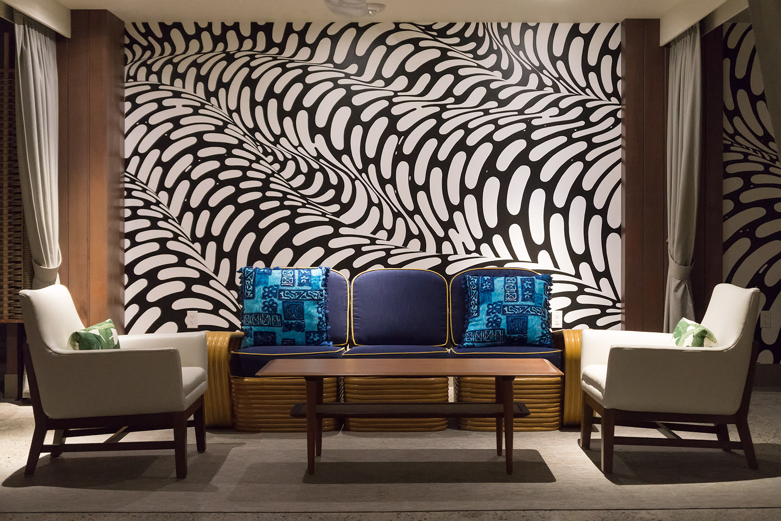 But not everything in the hotel is a throwback. Several artists, whose works you might recognize from POW! WOW! Hawai’i, have lent their hand in decorating the lobby. The rippling black-and-white artwork seen on the back wall was created by muralist Brendan Munroe. The Wooden Wave, a local husband-and-wife duo, painted a whimsical treehouse by the elevators. Restaurant diners sit on a set of picnic tables hand-painted by lettering expert Jeff Gress while a portrait by muralist Kamea Hadar hangs nearby.