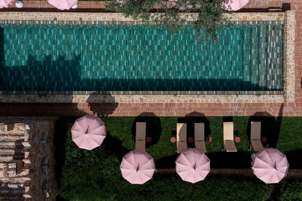 A stone tunnel with a scarlet red neon installation by American artist Joseph Kosuth paves the way to the reception where you’re handed a key to one of eleven rooms, each named after the family members of Gervasio Newton. Within these spaces, original wood-beamed ceilings and terracotta tiles are enhanced with purpose-woven fabric walls crafted by the Venetian artisan Chiarastella Catana and custom-made, mid-century vintage furniture including bouclé, velvet and silk upholstery. Bathrooms are just as carefully curated, with local Cotto Etrusco tiles that range from emerald green to sky blue, as well as marble sinks and bathtubs and showers, some built intp the wall and others stand-alone.