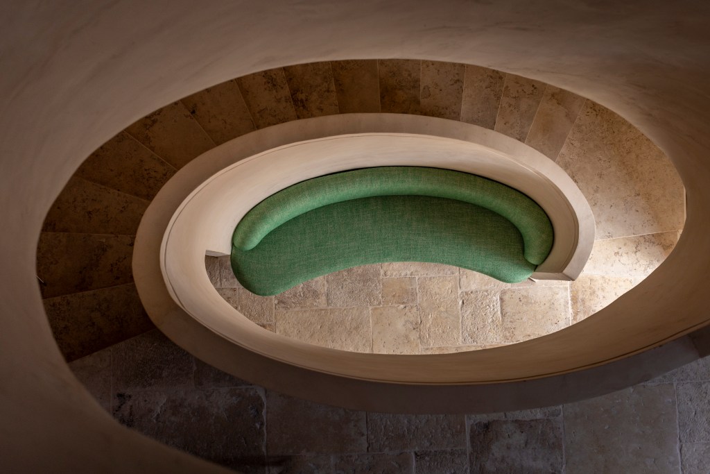 The property itself is a treasure trove of iconic designer pieces including Dedar fabric wall coverings that bring the cocktail bar and restaurant to life. In addition, you’ll find a custom-designed sofa by Antonie upholstered in Pierre Frey fabric, seamlessly integrated with the stone spiral staircase that connects the three floors. Furthermore, emblematic are the ‘70s Ico Parisi chairs that welcome guests in the reception as well as two “Committee Chairs” of Pierre Jeanneret in the Sofia Suite. The white walls also come to life, imbued with artworks by Lucio Fontana, Carla Accardi, Giosetta Fioroni, Ed Ruscha and Joseph Kosuth, as well as a five-meter sculpture by Swiss artist Ugo Rondinone that stands at the entrance of the winery.