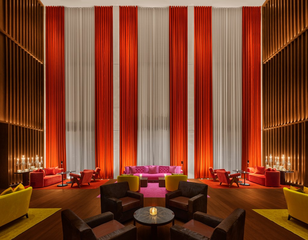 “Most of the property is fairly neutral in color, except for the Lobby Bar, an EDITION signature, which incorporates custom 50-foot-tall red velvet drapes,” Keffer says. “In the lobby, we brought things down with the hanging topiary, but in here we emphasize an expression of scale. The backbar features a towering display of artifacts and custom plaster cast artwork based on Mayan iconography. At night it comes to life with color. It’s up-lit. It glows.”